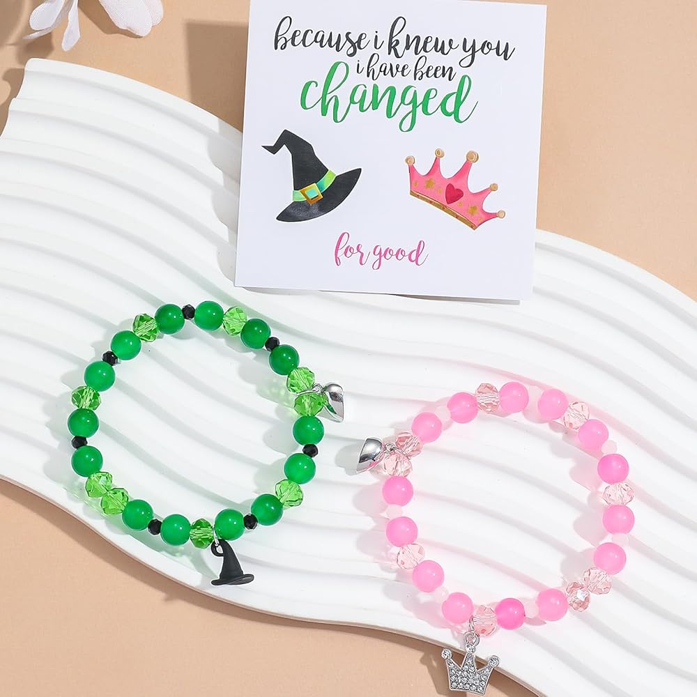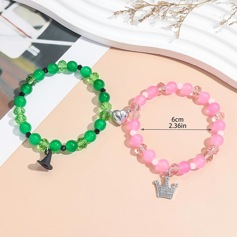 Best Friend Bracelet Set:You will get 2pcs bracelets,the pink bracelets features crown,the green bracelets features witch hat,they can be attracted to each other through the magnetic heart-shaped charm;Fun and suitable for friends,fans and any close ones