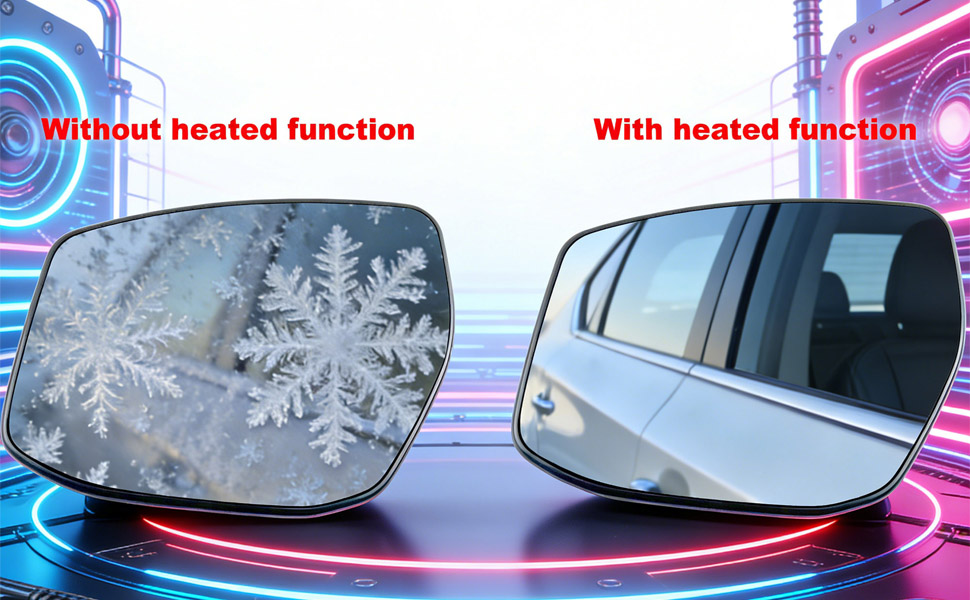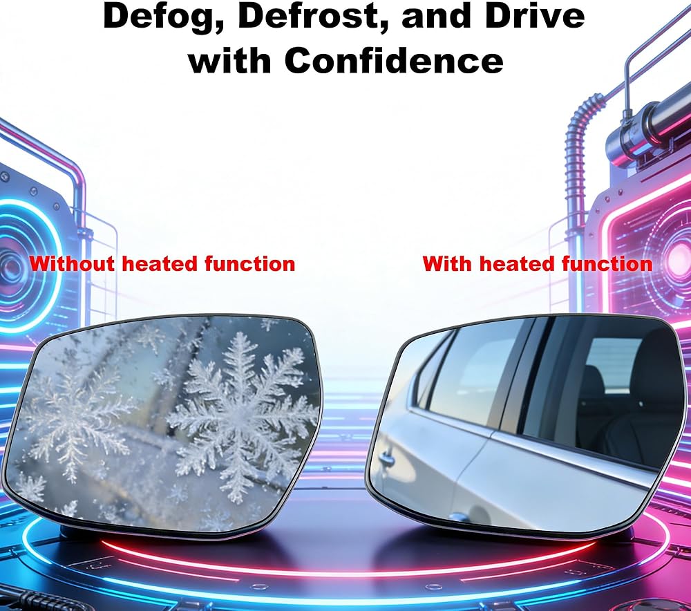 【Primary Function - Defog & Defrost】Equipped with an efficient integrated Defrost Defog Heating Element, the mirror heats up quickly and evenly when powered on. Its main function is to effectively melt ice and frost and evaporate rain and condensation from the mirror surface, solving visibility issues caused by low temperatures and humid conditions to ensure a clear view to the side and rear.
