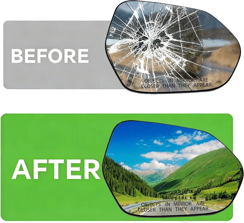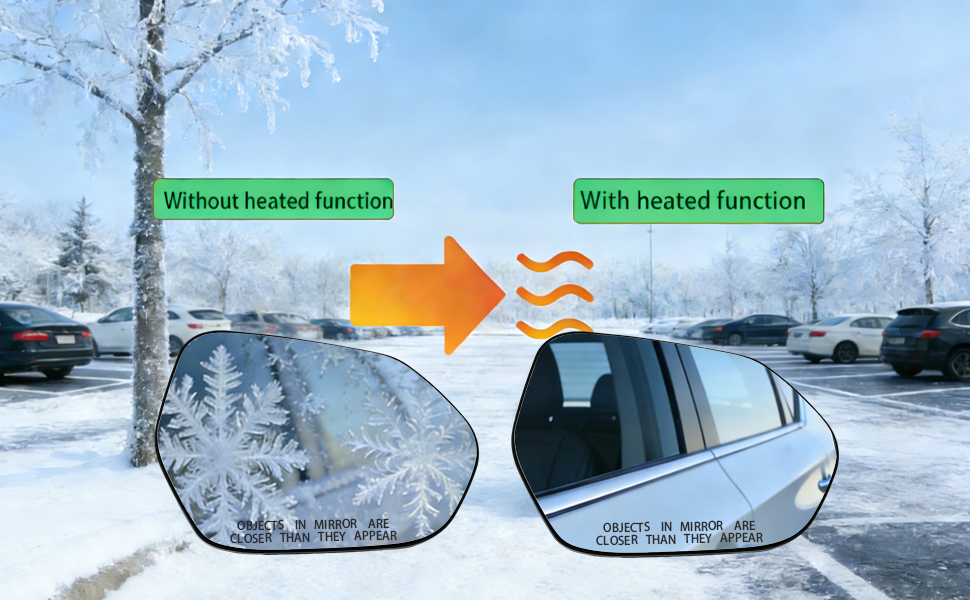 FEATURES: Side mirror glass with backing plate,This glass back of this passenger side door mirror replacement is designed with heated function to eliminate fog and melt snow or ice by heating from the inside out.Anti-glare to improve driving safety in rain or fog.
