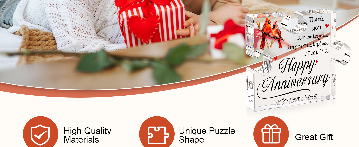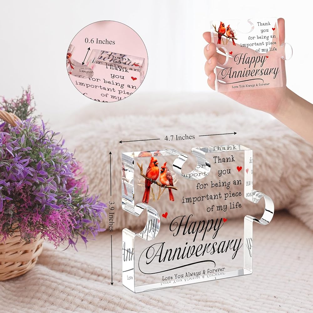 Celebrate Your Love with Style: This premium acrylic "Happy Anniversary" gift features a unique puzzle design and a vibrant red cardinal pattern, symbolizing enduring love. Perfect as an anniversary gift for her or him, it brings elegance and sentiment to any celebration.