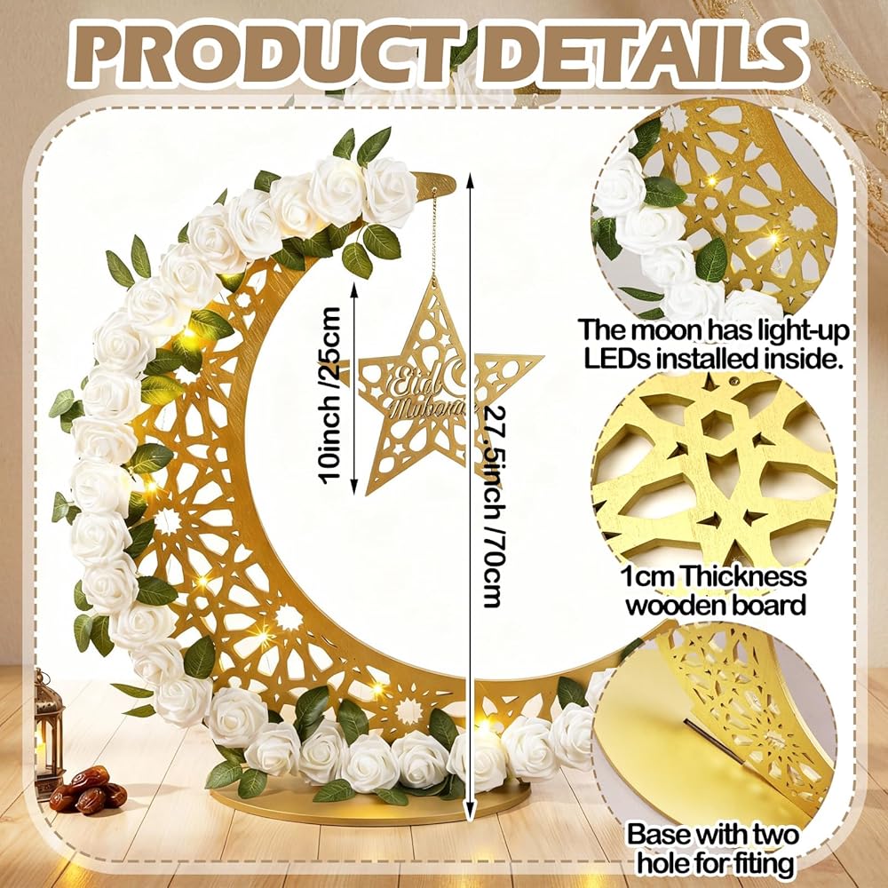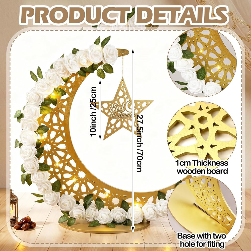 • Customizable Rose Arrangement Design: white rose decorations included in the Ramadan moon stand come with bendable poles that can be inserted into the gaps of the wooden moon edge; The poles can be bent freely to achieve your desired DIY arrangement effect, allowing you to personalize the look of the decor according to your specialty preference; The ability to adjust the rose placement ensures the decor can match different table settings or display areas with ease