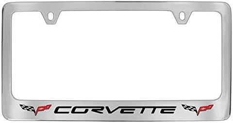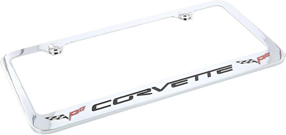 These beautifully detailed frames have a solid brass core with heavy chrome plating. The C6 flags are detailed in red, black and white with Corvette in the C6 factory font. Matching chrome screw cap covers are included.
