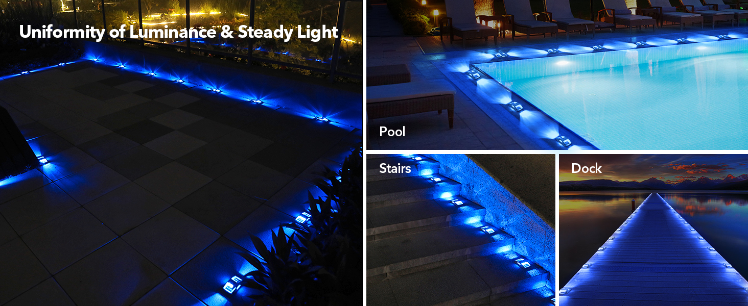 【Solar Powered & Easy to Install】100% solar powered lights and easy to install without wire, widely used as solar driveway / step / yard / deck / dock lights, also can be a pool, yard, garden path decor. Out-of-the-box, simply turn on the switch first, fix it with provided screws