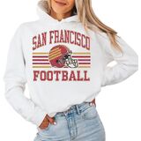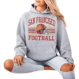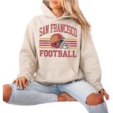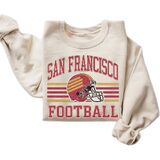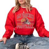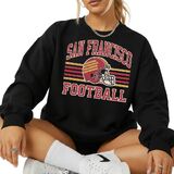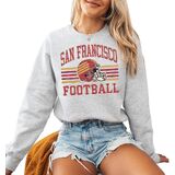 This distressed San Francisco football crewneck sweatshirt delivers a nostalgic varsity vibe with a worn-ink retro helmet design and classic stripe layout. Soft, cozy and easy to style with denim or leggings, it's a comfortable pullover for relaxed weekends, casual hangouts, or cool weather layering. A vintage-inspired sport aesthetic for everyday wear.