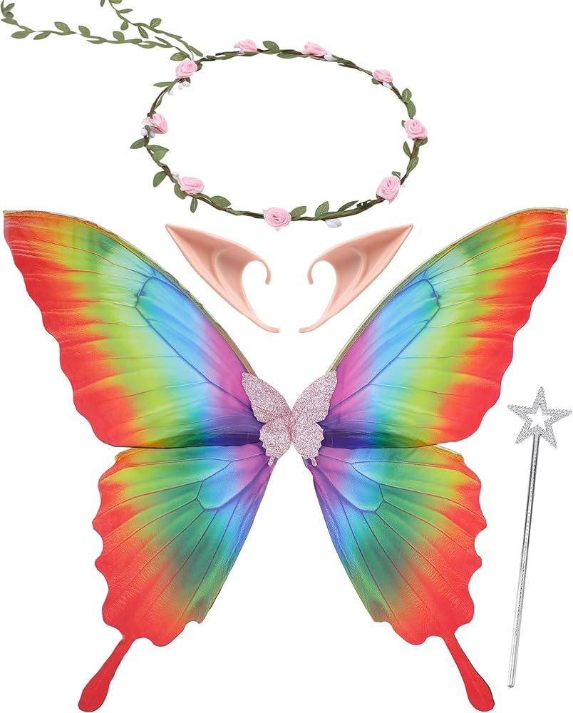 Product Description: Package Include: a pair of butterfly fairy costume wings, a pair of elf ears,1X flower fairy crown.enter a magical world of elves with our fairy costume wings costume set. This is a prop to help you become the focus of the party.Sparkle Halloween fairy costume wings for s and adults. These bright butterfly wings are perfect for Halloween costume parties, fairy birthday parties, fairy costumes, cosplay party costumes, tooth fairy costumes, and makeup masquerades. You can use it with puffy dresses, fairy dresses, princess dresses, tops, fairy wands, fantasy sandals, etc