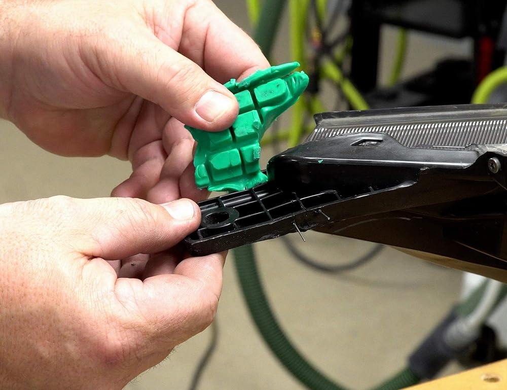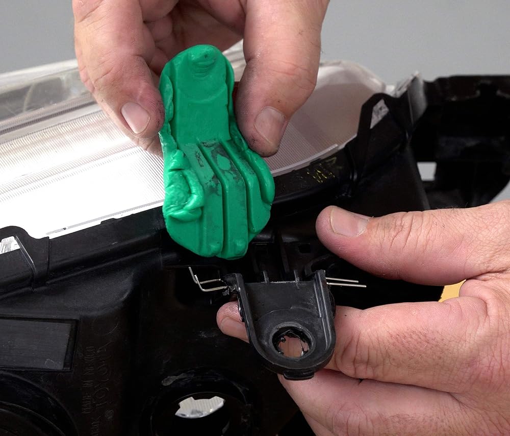 Many headlight tabs have complex features that are very difficult to restore. If the headlight tab is visible to the vehicle owner, it must be repaired and refinished to the original appearance. 6225 Tab Magic Molding Putty from Polyvance helps ease the refinish of these complex tabs by preventing the backside weld from blowing through and creating imperfections that would be difficult to refinish. 6225 Tab Magic Molding Putty is a two-part moldable, flexible silicone rubber which is non-toxic and temperature resistant. Mix equal parts until a uniform green color is achieved, then quickly press onto the headlight tab.