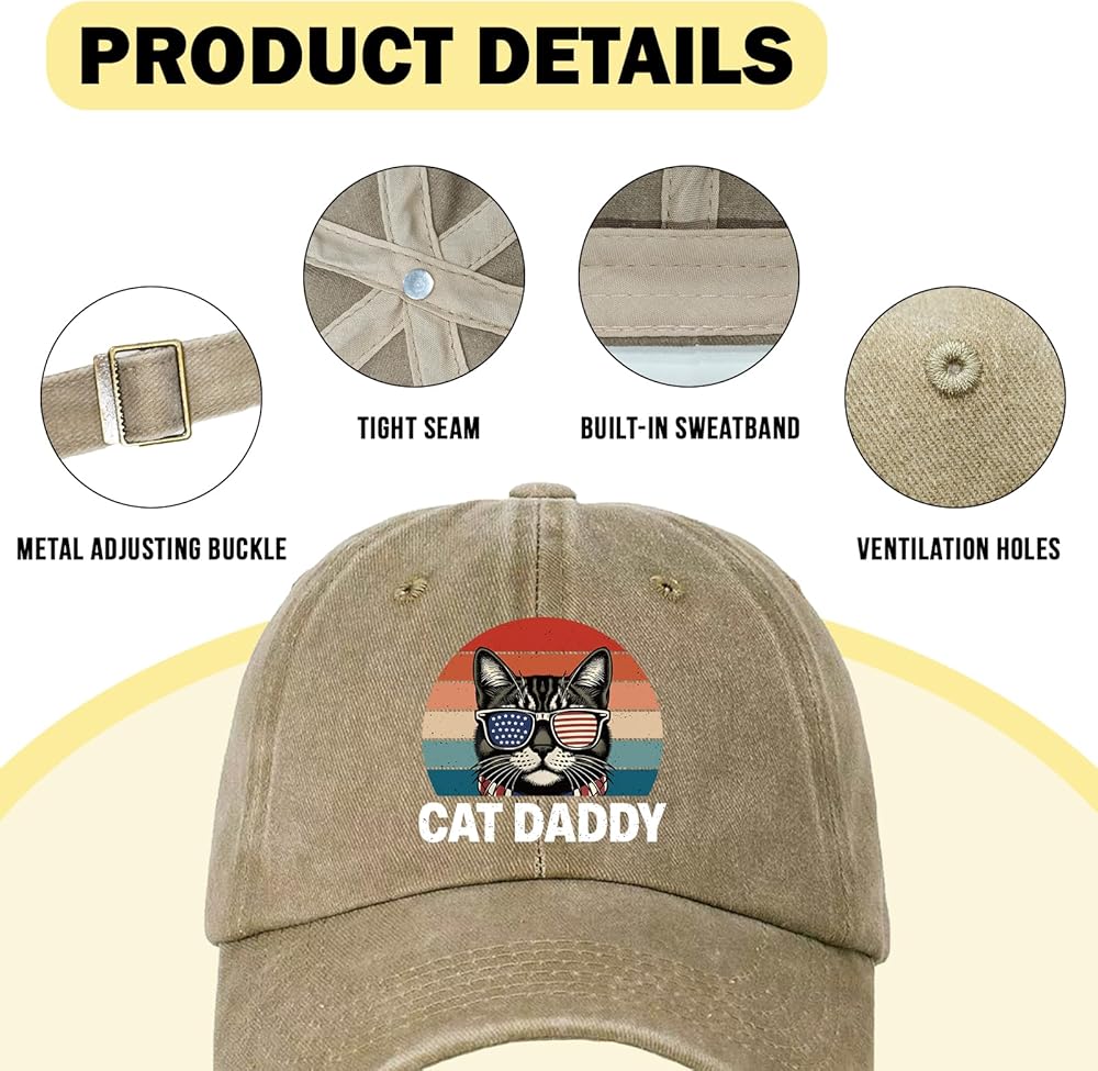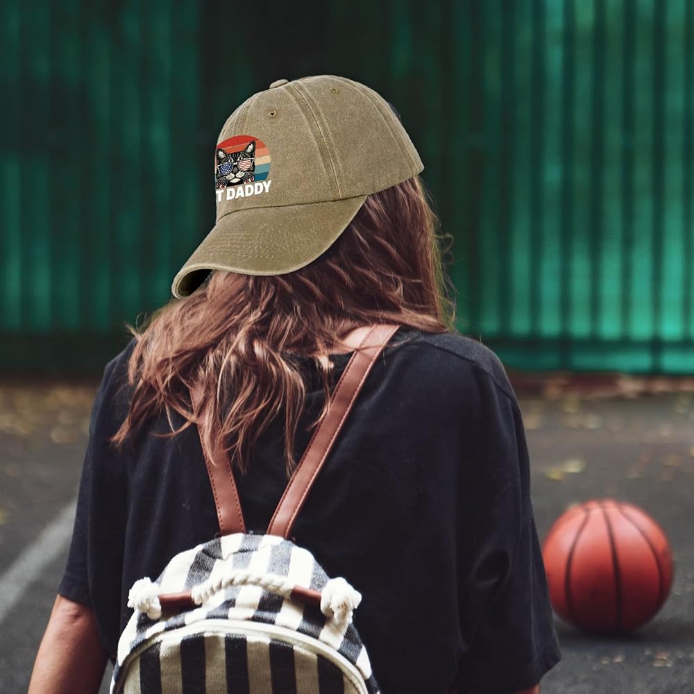 Funny Cat Baseball Cap Cat Daddy Printed Cotton Adjustable Hat for Men Vintage Distressed Washed Khaki Baseball Hat Great Birthday Gift for Dad Grandpa Friend Coworker Neighbor Cat Lover