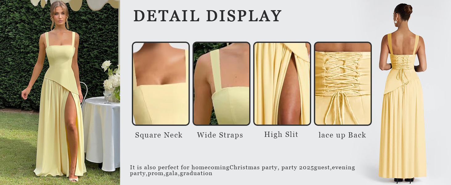 Welcome to Plakend, the store mainly sells bridesmaid dresses, prom dresses, flower girl dress and all kind of formal dress for women Linearity: Irregular A-Line Feature: Chiffon, Satin, Spaghetti Straps, Sleeveless, Square Neck, Corset, Drop Waist, High Slit, A-Line, Floor Length, Long Dress for Summer, Formal Pageant Dress for Photoshoot Back: Lace Up Backless 1.Please confirm your size with us after placing your order. 2.Of course, we also support free customized size, you can tell us your size after you place an order, we will make the dress according to your size. Bust:_____ inch Waist:_____ inch Hips:_____ inch Shoulder to Floor: _____ inch 3.If you have any questions, please ask us, we will provide you with the most effective solution as soon as possible!