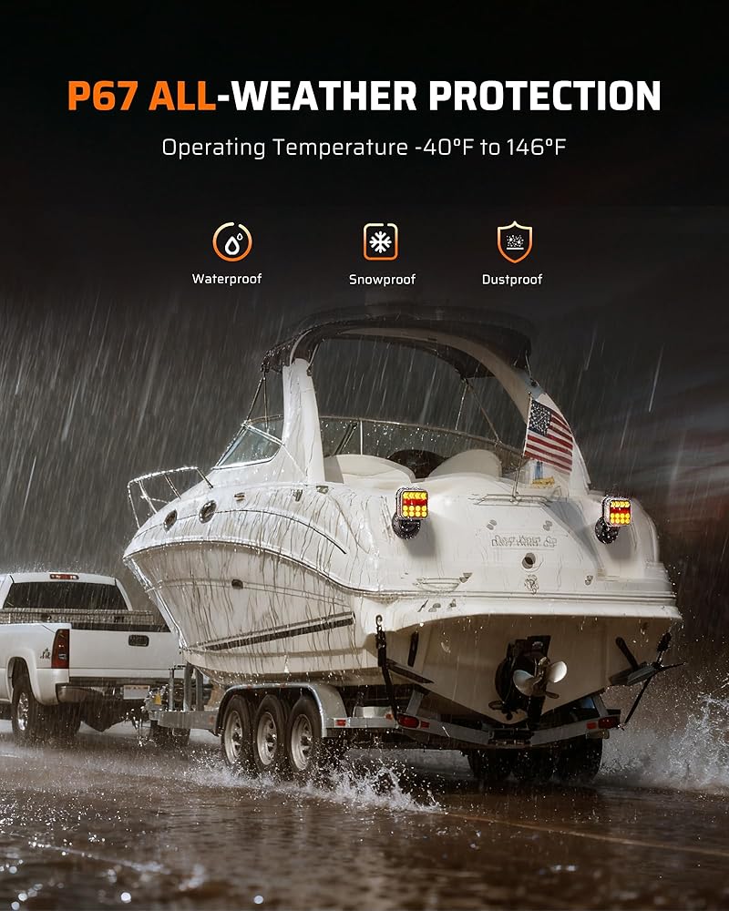 Smart 2.4GHz Wireless with Auto Channel Switching: Built with advanced 2.4GHz multi-channel transmission, these wireless trailer lights automatically detect interference and switch to the clearest signal. Enjoy stable, lag-free performance up to 100 feet, perfect for most towing needs including utility trailers, mid to large-size RVs, and boat haulers.