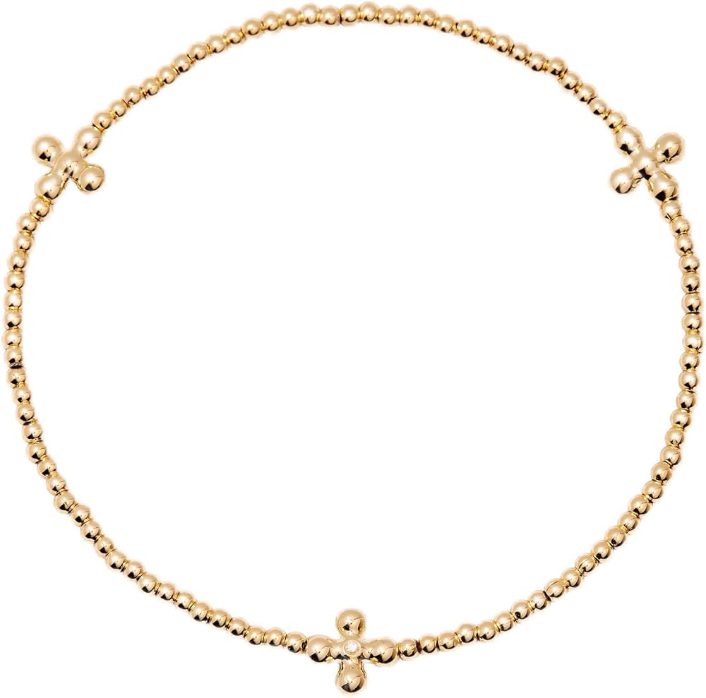 Add a playful touch to your look with the Rylee Beaded Cross Bracelet. Featuring stretch design for easy wear and charming cross accents, this bracelet effortlessly blends comfort with style. Perfect for layering or wearing solo, it's a fun accessory that brightens any outfit! Available in 14k gold plated brass 7" stretch bead bracelet 2mm beads with 7.5mm cross accents Protected with an anti-tarnish barrier SKU: BYB1324