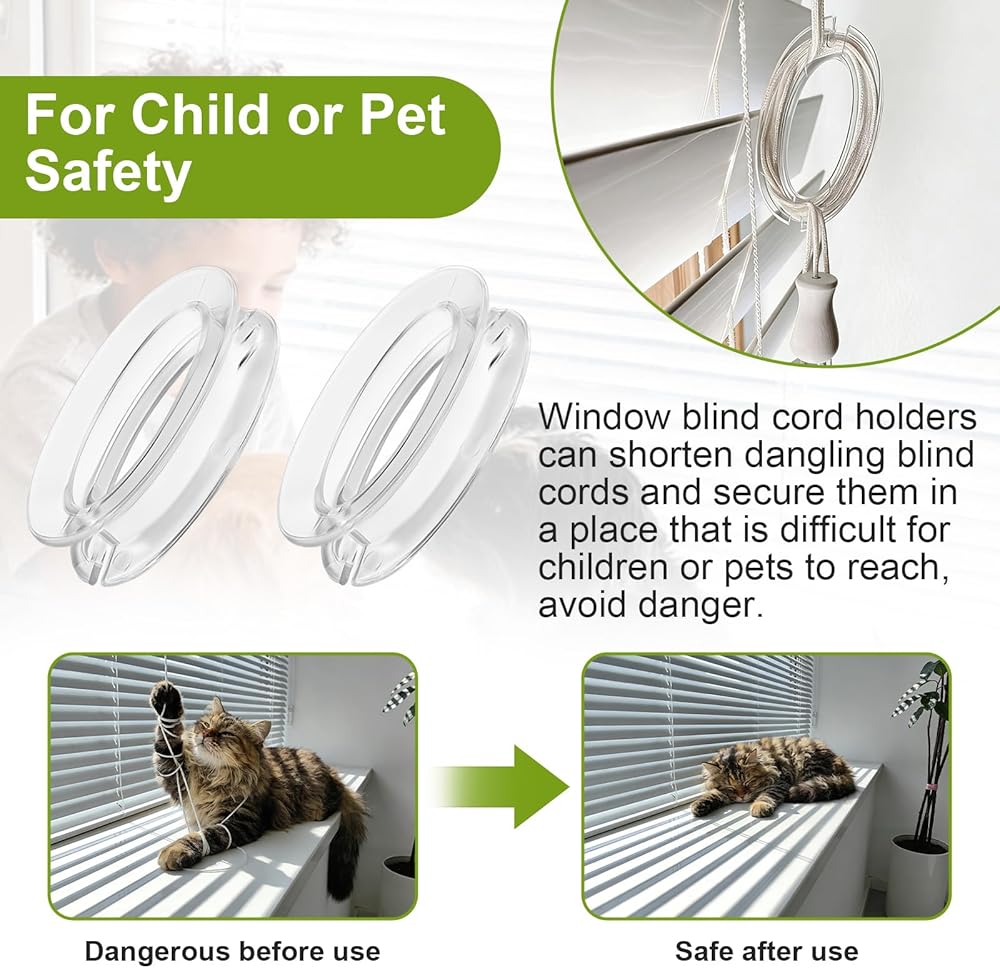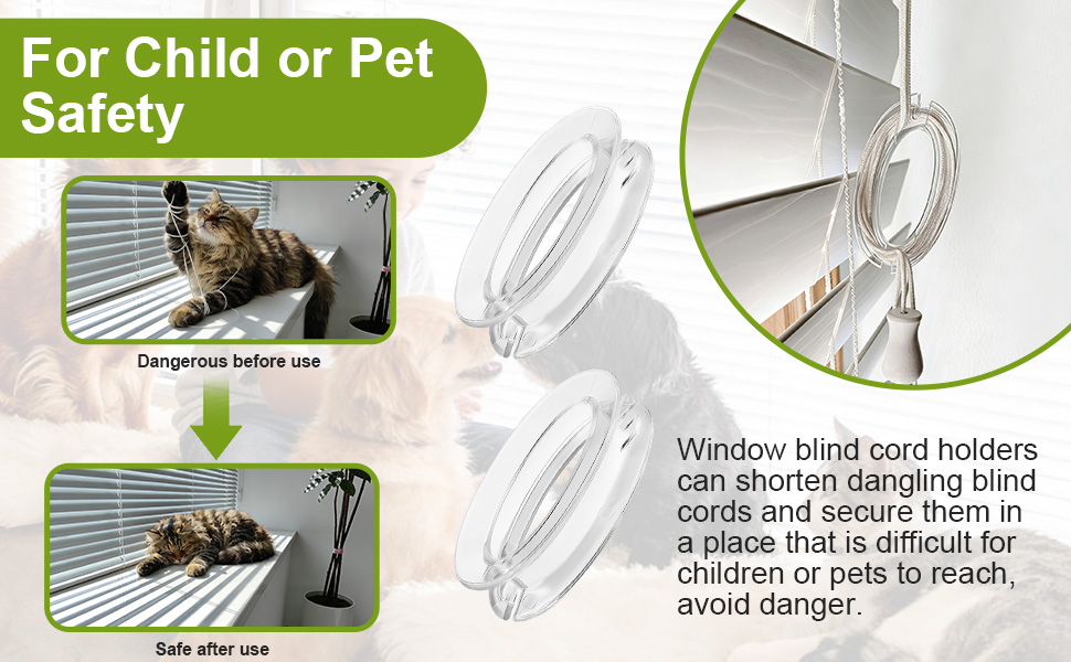 For Child or Pet Safety : Window blind cord holders can shorten dangling blind cords and secure them in a place that is difficult for children or pets to reach, avoid danger, provide a safe environment