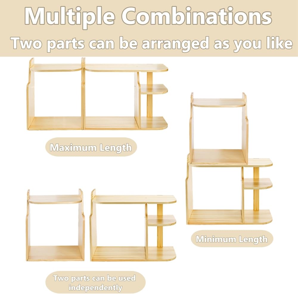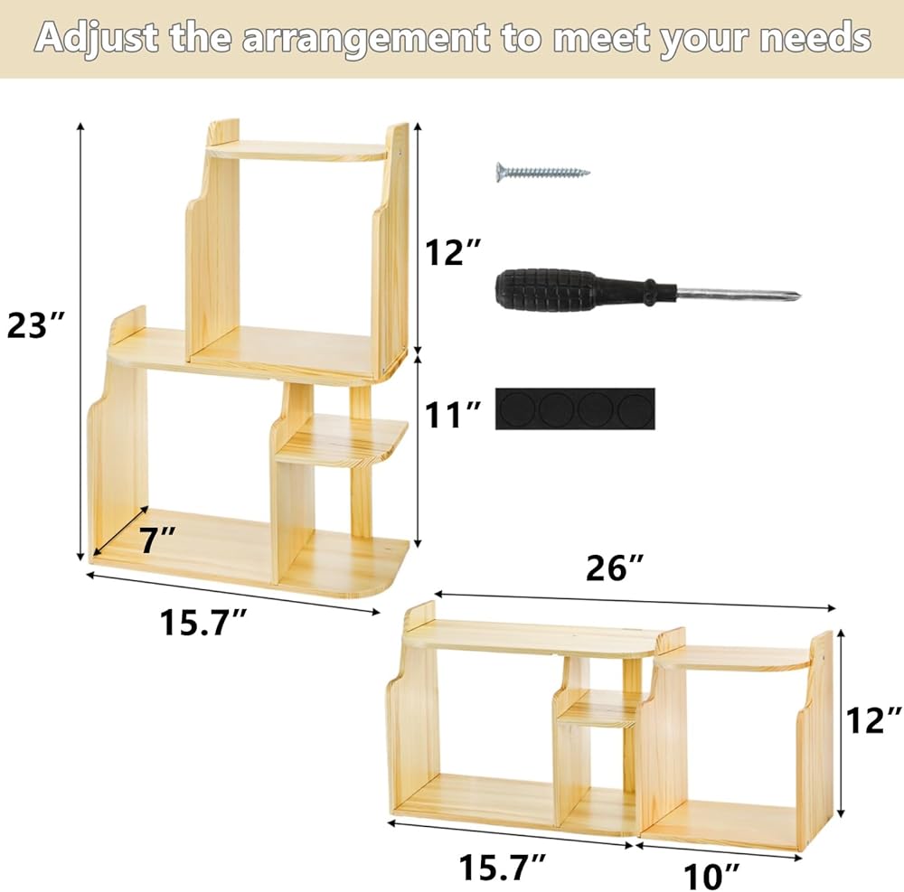 Solid Wood Build: Made from durable pine wood with 0.37" thick panels, this wood display shelf offers reliable strength and balance even when fully loaded. Rounded edges reduce the risk of bumps, while anti-slip pads keep the unit stable on your desk
