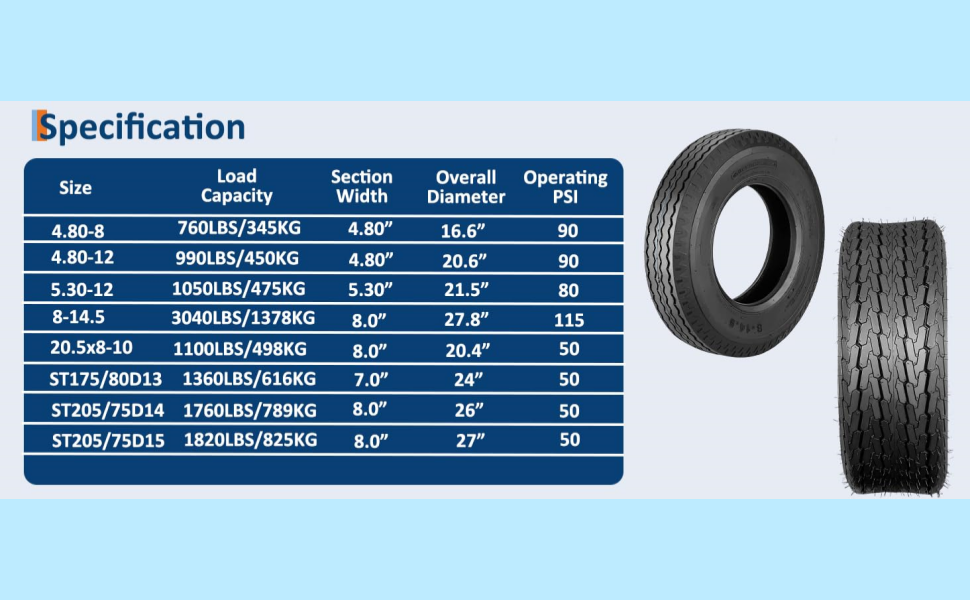 【Heavy-Duty Construction for Safe Hauling】 Engineered with a robust 6-Ply Rating (Load Range C), these trailer tires support up to 475 lbs each at 80 PSI, providing the strength and reliability needed to carry your cargo securely and reduce worries about blowouts or failures on the road.