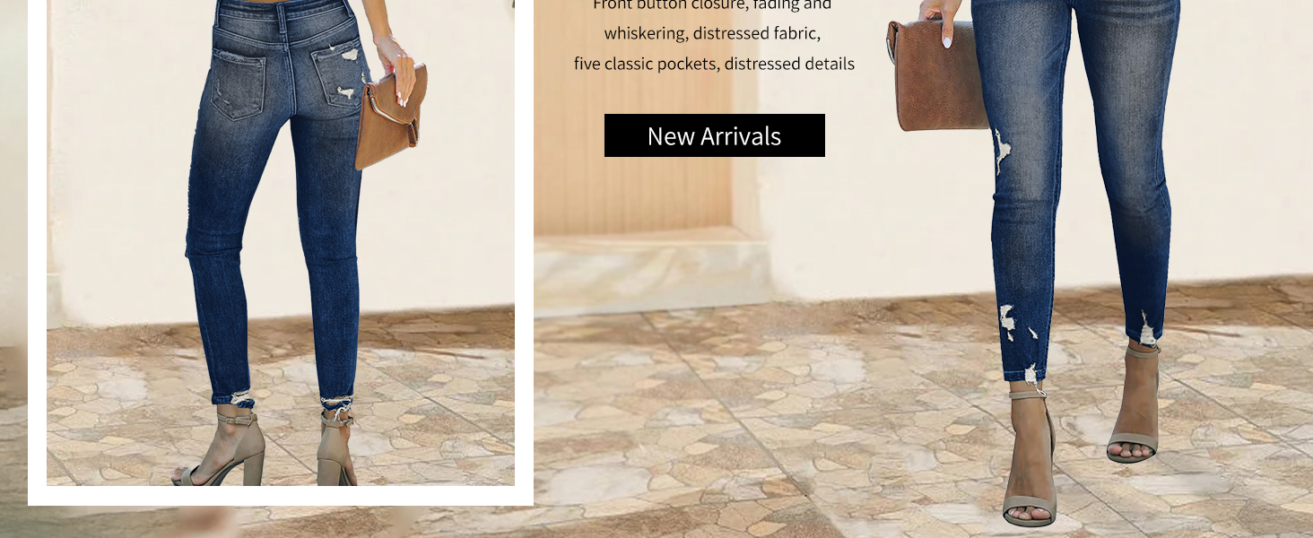 DESIGN:Front button closures,fading & whiskering,distressed fabrication,classic 5 pockets,destroyed detail。This ripped skinny jeans for women will highlights your sexy figure and make you stand out in the crowd.
