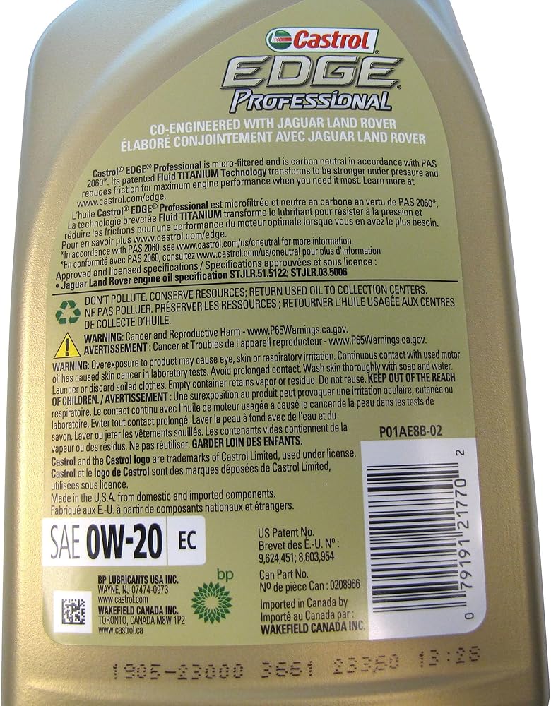 Oil: OEM Genuine Synthetic SAE 0W-20 EC. This high-quality synthetic oil is the correct weight and grade formulation for your vehicle (15AF6F, Specification STJLR.51.5122 and STJLR.03.5006.) It is the OEM-specific oil developed in conjunction with Land Rover.