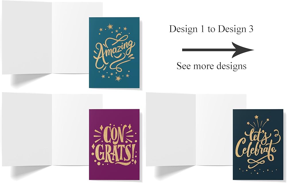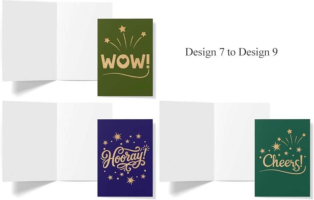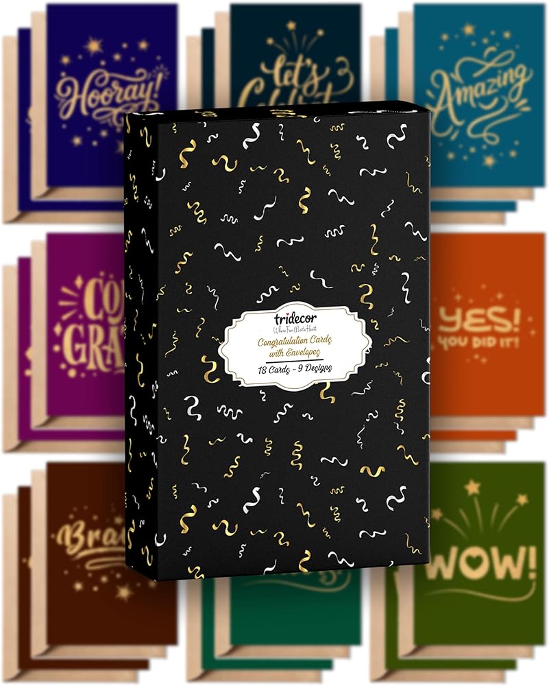 This Congratulation Cards set by TRIDECOR includes 18 premium 5" x 7" folded cards across 9 unique congratulatory designs, giving you the flexibility to celebrate any achievement—big or small.