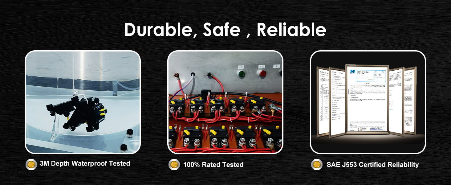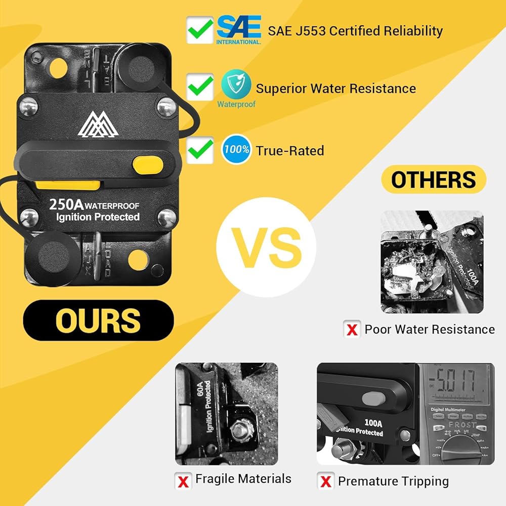 [100% Rated] Upgrade your car or marine with our new performance version circuit breaker. Runs stable at full 250A load, ensuring reliable power supply. Precision Tripping at Full Capacity Holds Full 250A - Ultimate Reliability.