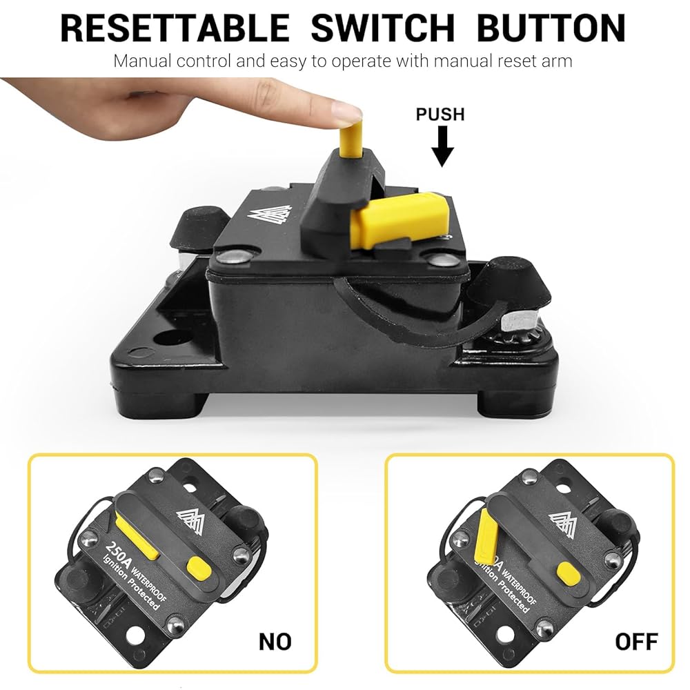 [Versatile Applications] Ideal for a wide range of vehicles and systems, 250 amp breaker is perfectly suited for boats, RVs, yachts, trailers, buses, trucks, ATVs, solar system, battery chargers, and DC sound amplifier systems. It's designed to enhance the safety and functionality of your auxiliary and accessory circuits.