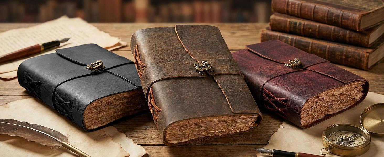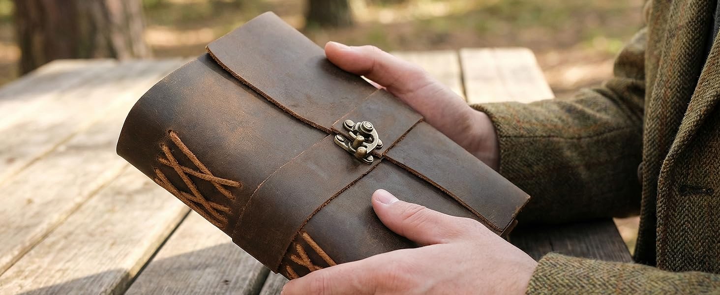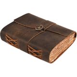 JOURNAL NOTEBOOKS WITH STURDY BINDING: Belt Wrap around closure with Antique Bras lock to keep the papers of the journal safe when not being used. A sturdy hand stitched binding to make sure that no paper comes out loose.