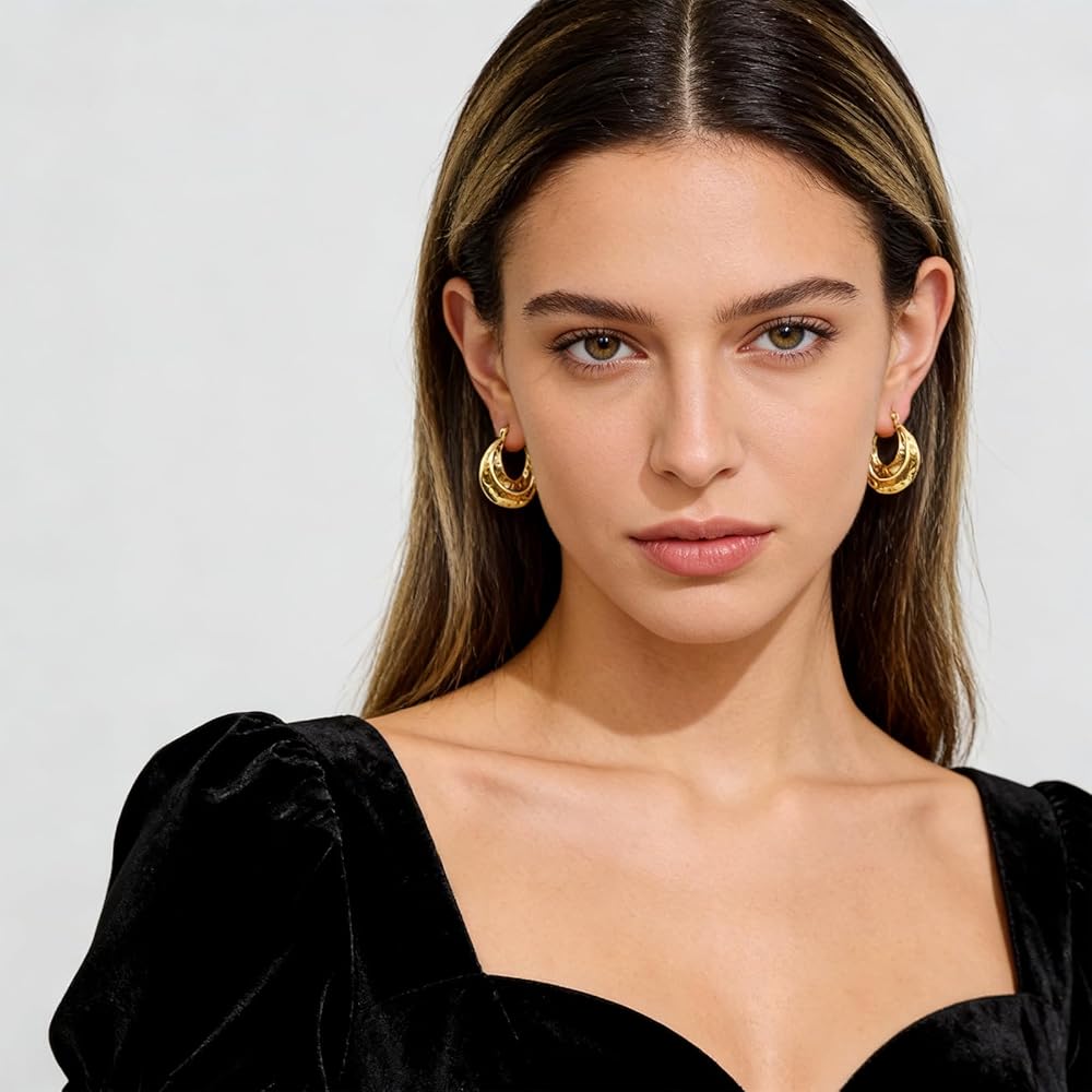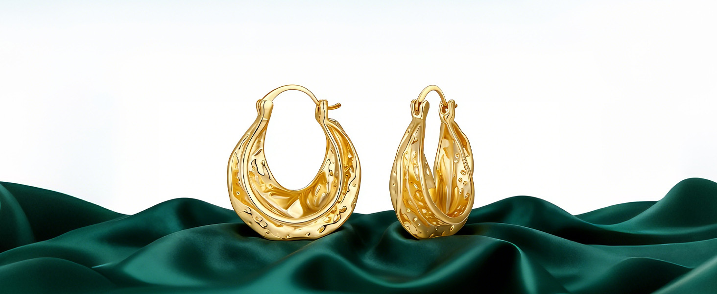 Chunky Hoop Earrings for Women: The gold chunky hoops feature a unique hammered texture that creates delicate light reflections and dimensional detail, effortlessly adding a trendy vibe to any look.