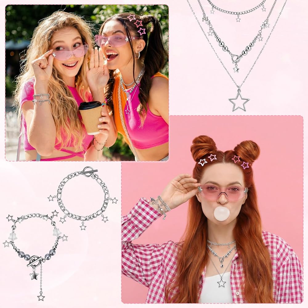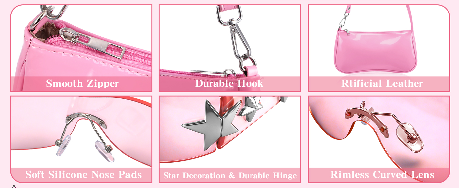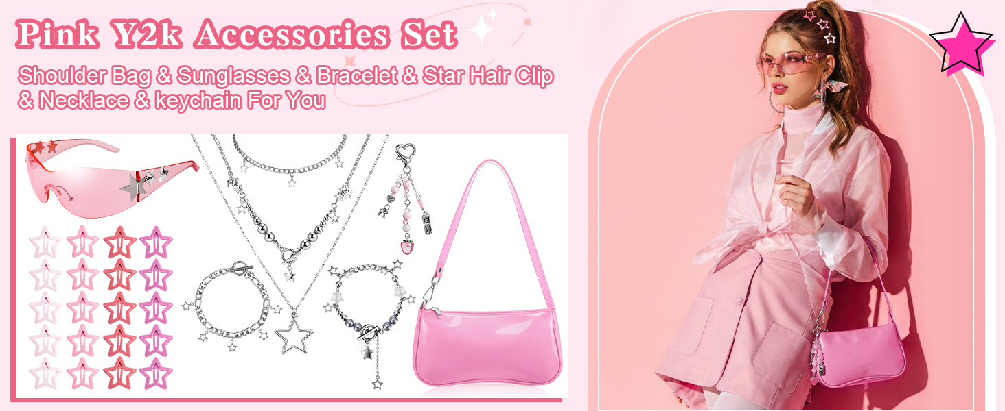 Package Contents: this y2k accessories set is all you need to complete your y2k 2000s rave look; The package includes 1 pair of pink sunglasses, 1 pink shoulder bag, 1 grunge layered necklace and 1 pair of y2k star bracelets, 20 star clips and1 Keychain