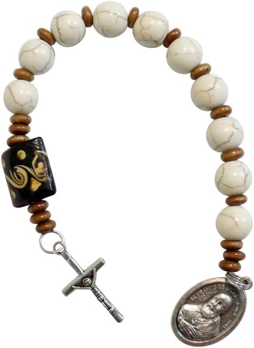 Saint Francis De Sales Patron of Those with Hearing Problems White Magnesite Round Beads Chaplet Silver Plated Crucifix and Medal Large Carved Wood Square Pater Noster Includes Blessed Prayer Card