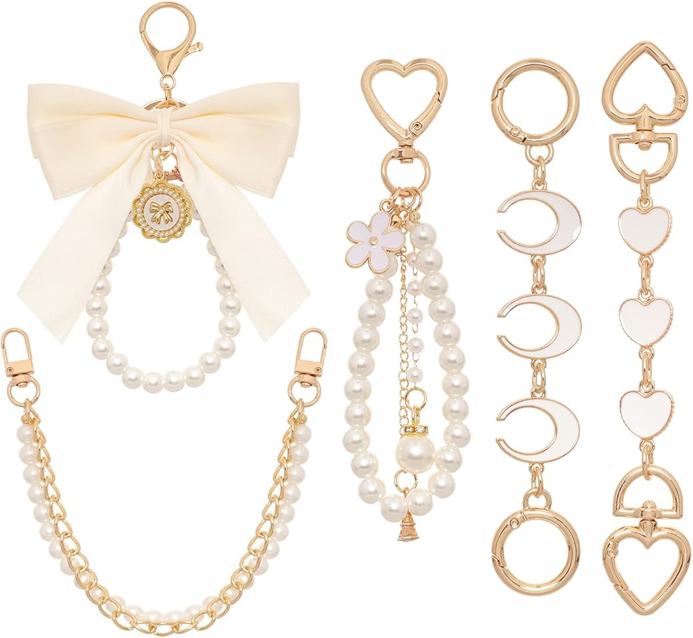 Included Components: 1 bow pearl chain, 1 star-moon pendant chain, 1 heart pendant chain, 1 pearl tassel chain, 1 metallic pearl chain