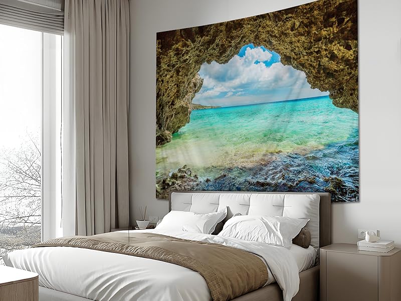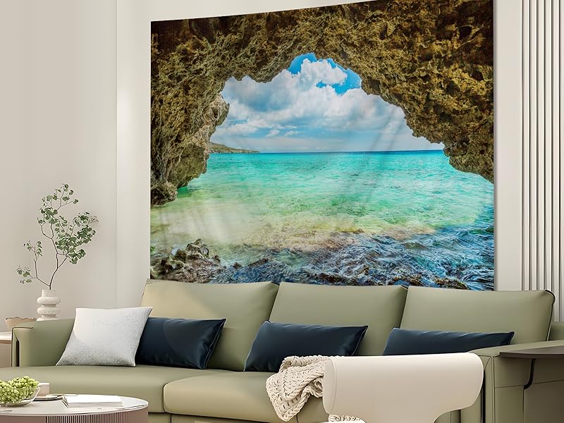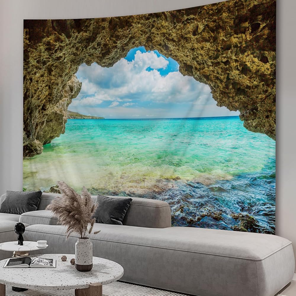 Stunning Visuals: This nature tapestry showcases a breathtaking view of the ocean through a cave. The vivid colors, from the turquoise waters to the fluffy white clouds against the blue sky, combined with the realistic texture of the cave, create a 3D like visual effect that makes it seem as if you're gazing out at the real seaside