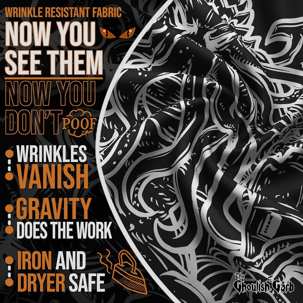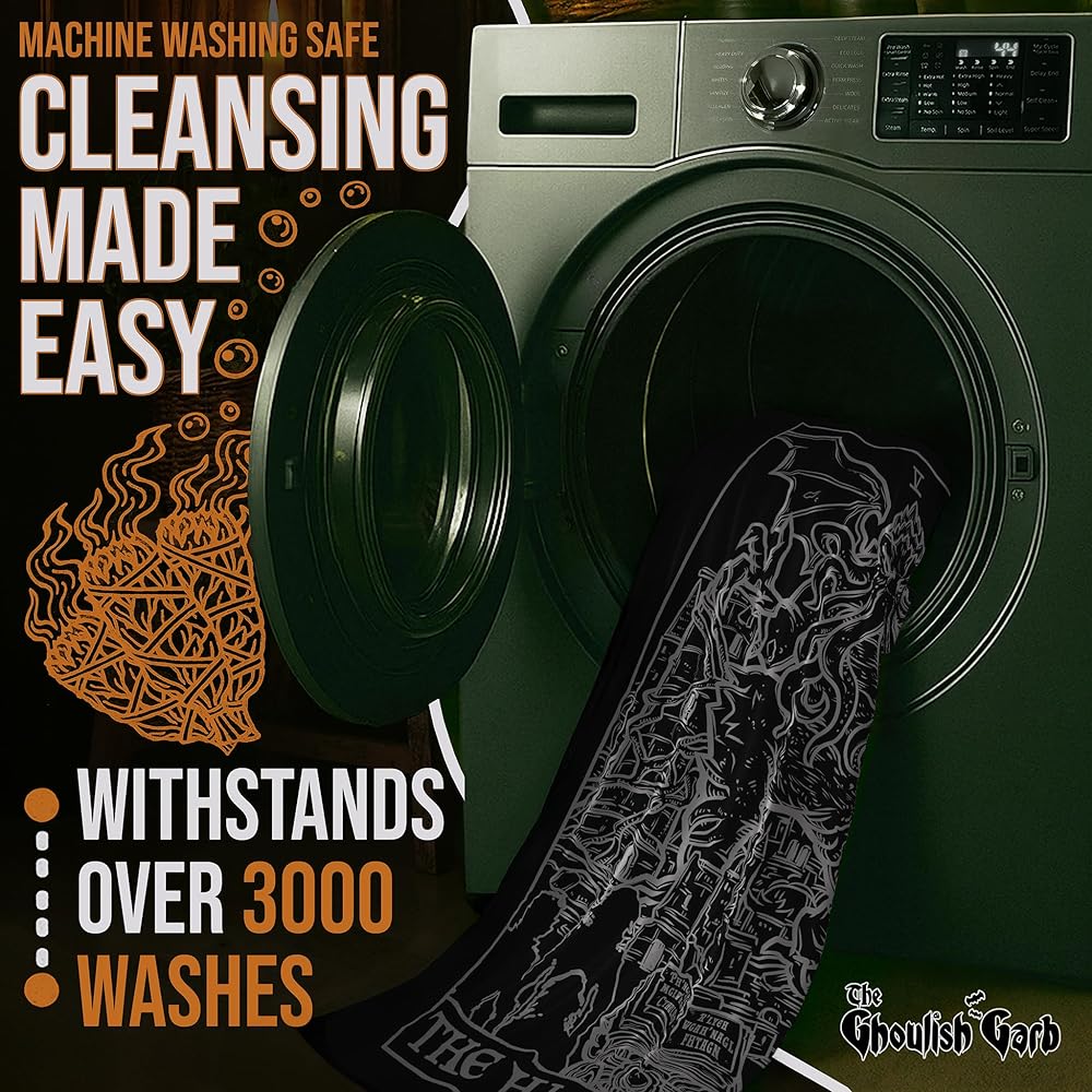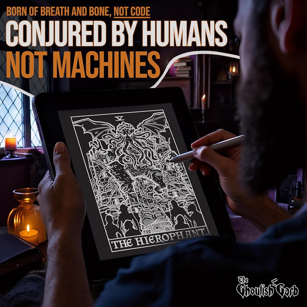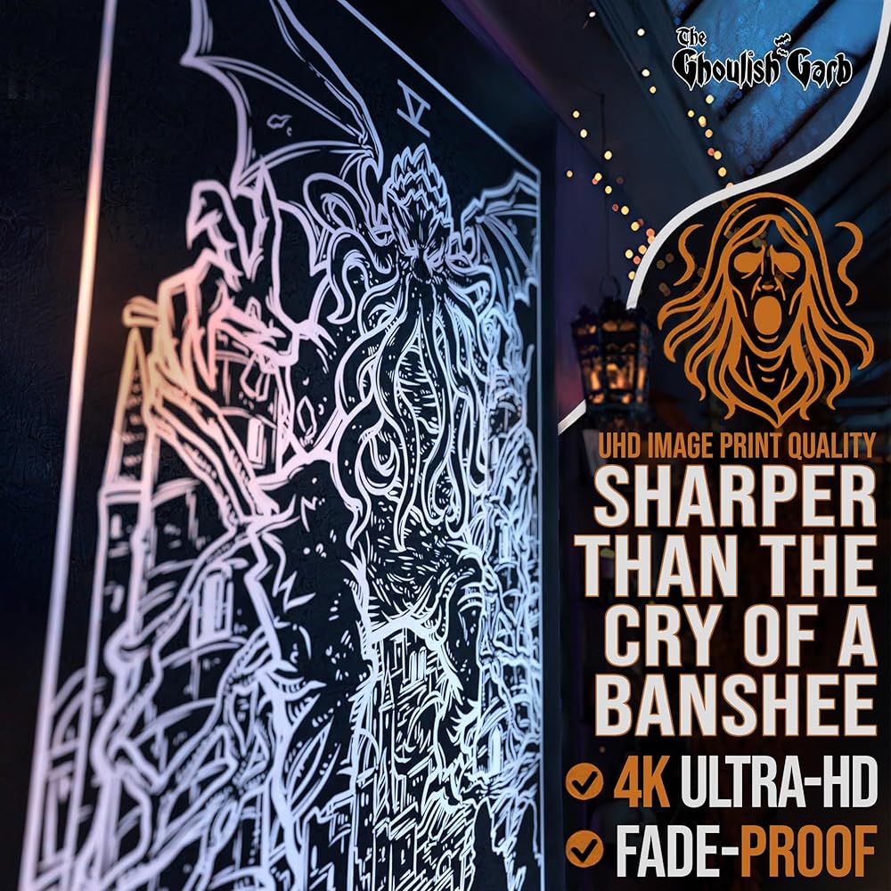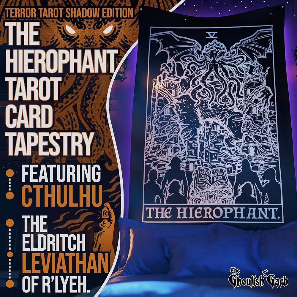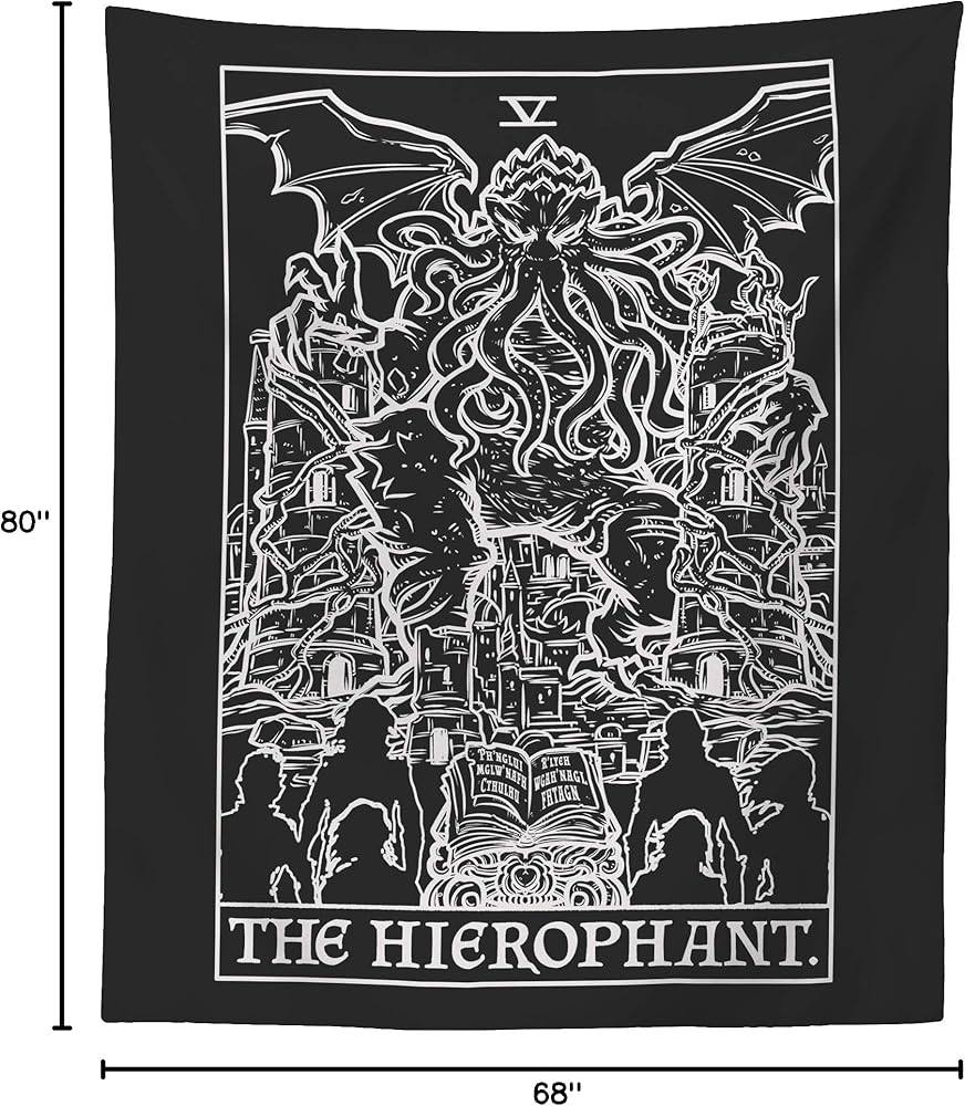 Our version of The Hierophant illustrates Cthulhu as the central player and male counterpart to Medusa in The High Priestess. Towering above the sunken city of R'lyeh, Cthulhu is flanked by two mountainous buildings. His ability of cerebral persuasion, enormous size, and cosmic origin symbolize his dominion over the subconscious, conscious, and superconscious realms respectively. This is also signified by the three tiers of his crown. He blesses his worshipers with his right hand, pointing two fingers toward the cosmos and the other two fingers toward the city of R'yleh. Below him, in the forefront of the card, we see an array of decaying worshippers as they make their way toward the underwater burgh in hopes of becoming enlightened by the one they praise; not even death could keep them from pursuing The Hierophant's sacred knowledge. These followers represent our own path toward higher thought and learning. They chant the words "Ph'nglui mglw'nafh Cthulhu R'lyeh wgah'nagl fhtagn". Directly translating to, "In his house at R'lyeh, dead Cthulhu waits dreaming," these words are written into a book located on a pedestal. The aforementioned dictum originates from Cthulhu's ability to manipulate the human mind (subconscious) and as a result, manifested itself through spoken dialect (conscious). The podium balances these two mediums in written text.