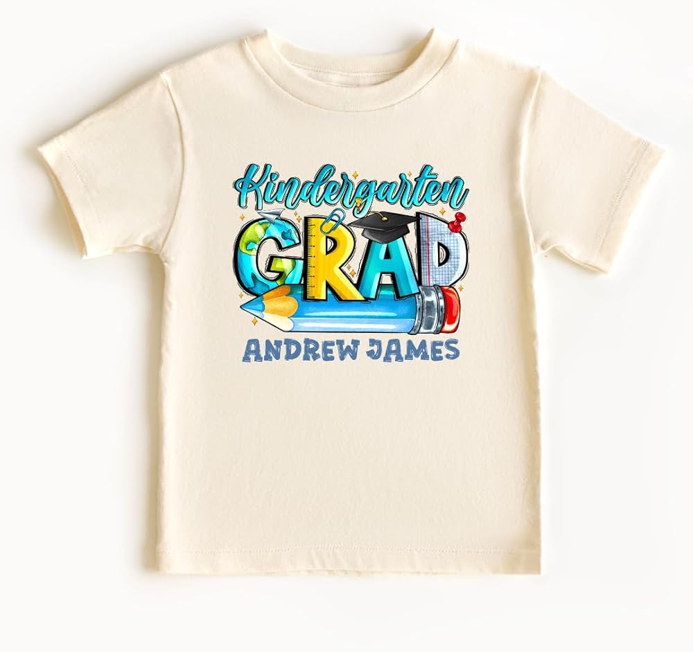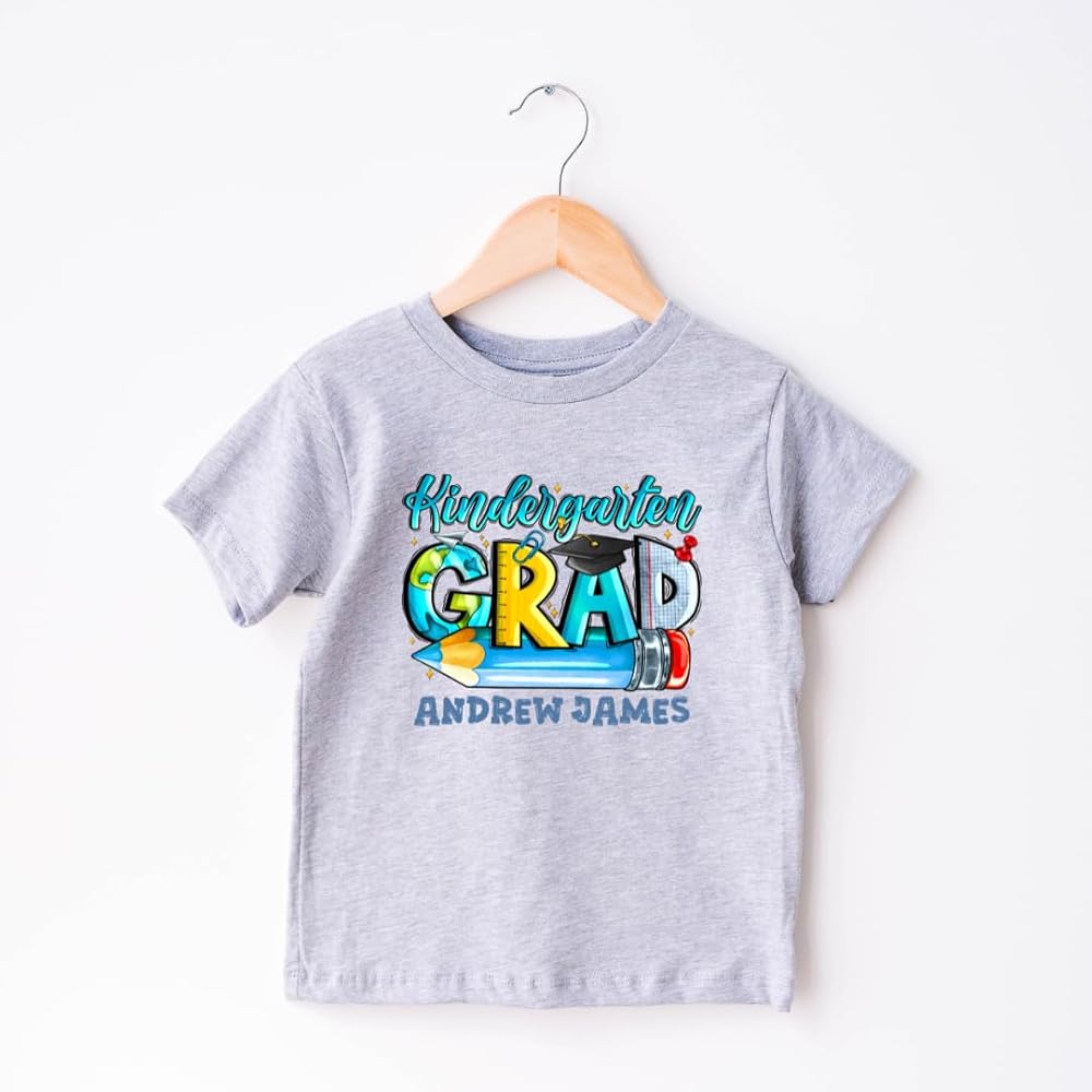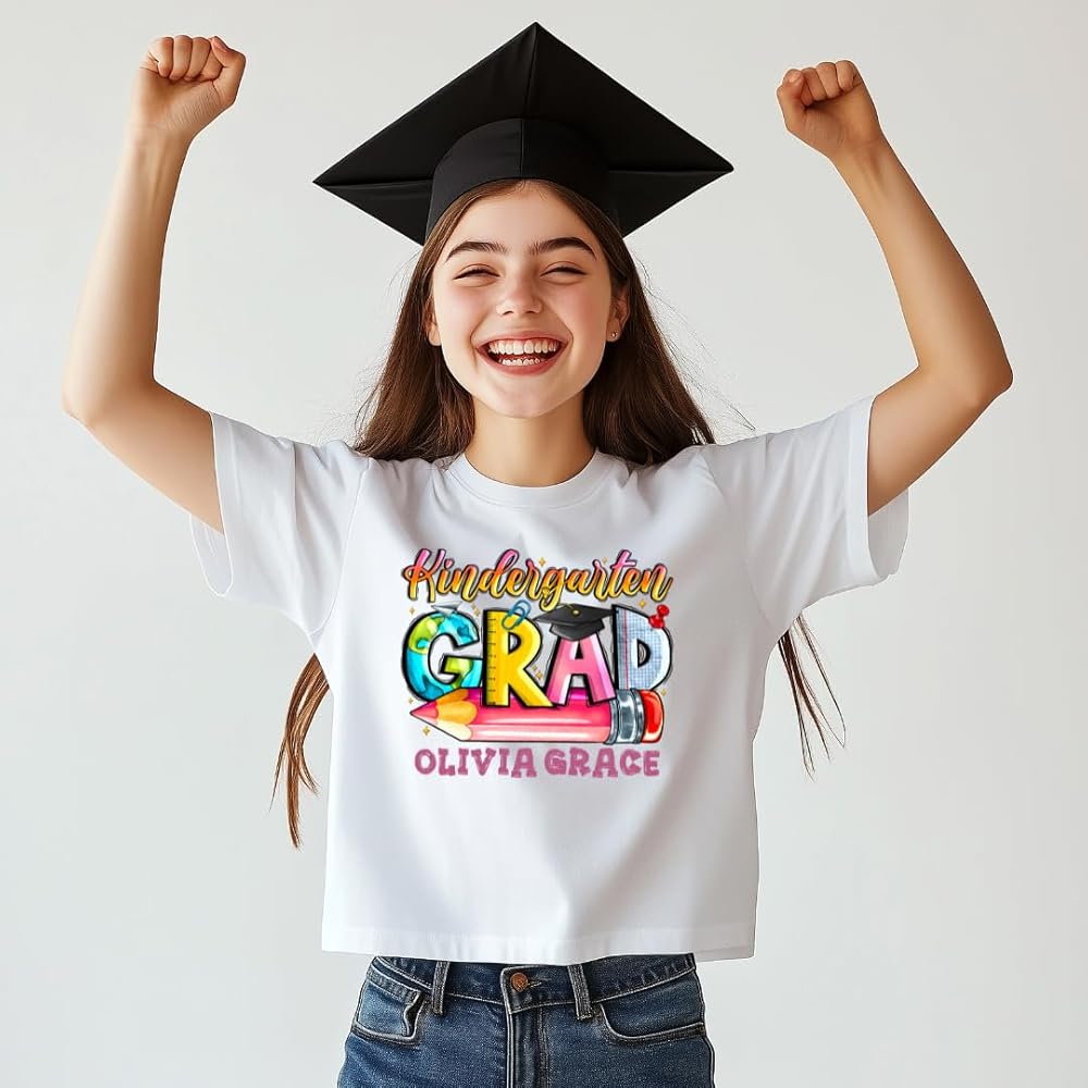 Preschool and Kindergarten graduation are huge moments for little learners. This personalized graduation shirt helps your child feel proud confident and extra special on their big day. Featuring a bright colorful school themed design with pencils books and graduation cap plus their custom name this tee becomes more than just clothing — it becomes a memory. Perfect for: 📸 graduation photos 🎓 school ceremonies 🎉 last day of school parties 🏫 classroom celebrations 💝 keepsake gifts Made soft breathable and toddler friendly so kids stay comfortable while they play smile and celebrate. Whether it's Pre-K or Kindergarten this graduation shirt makes their big moment unforgettable. Because every little grad deserves to shine ✨
