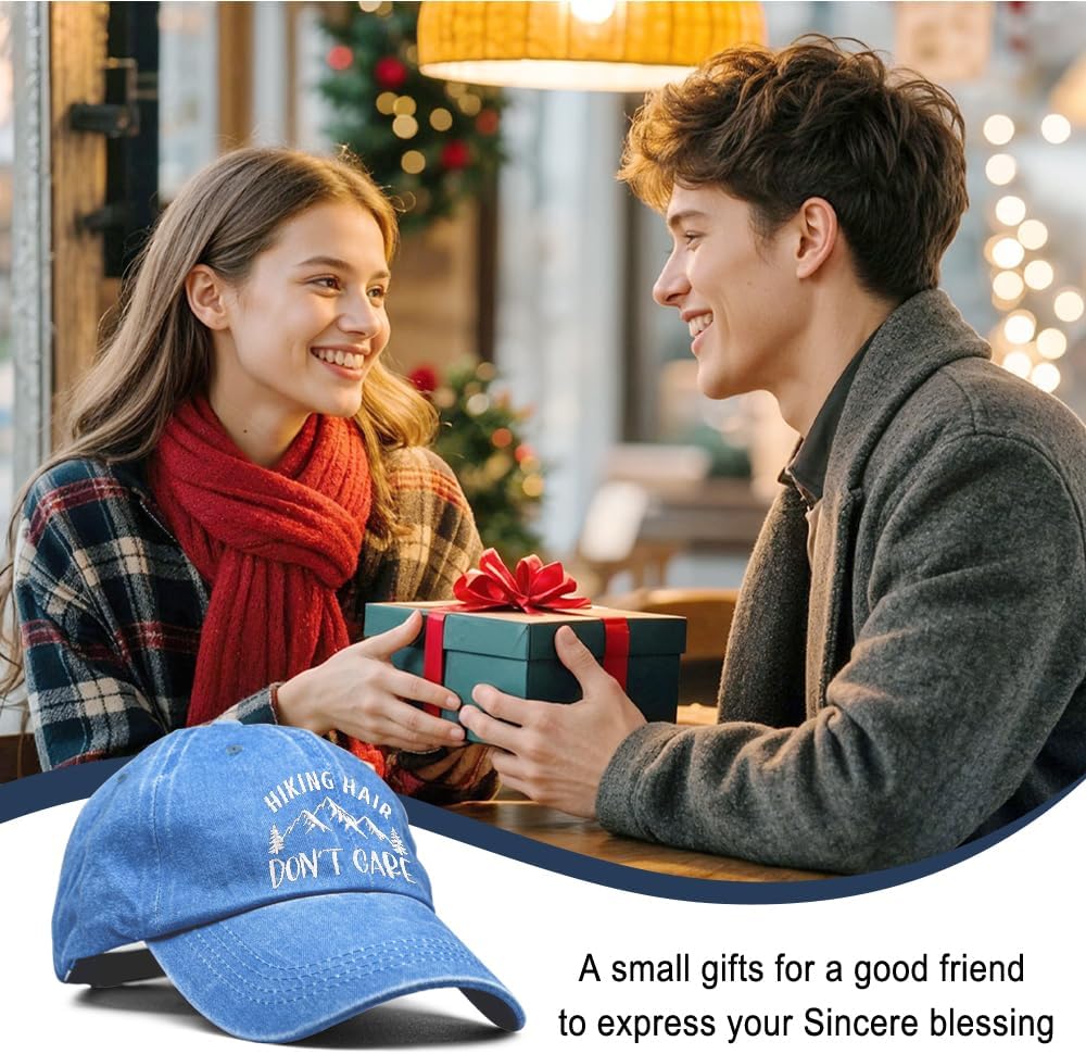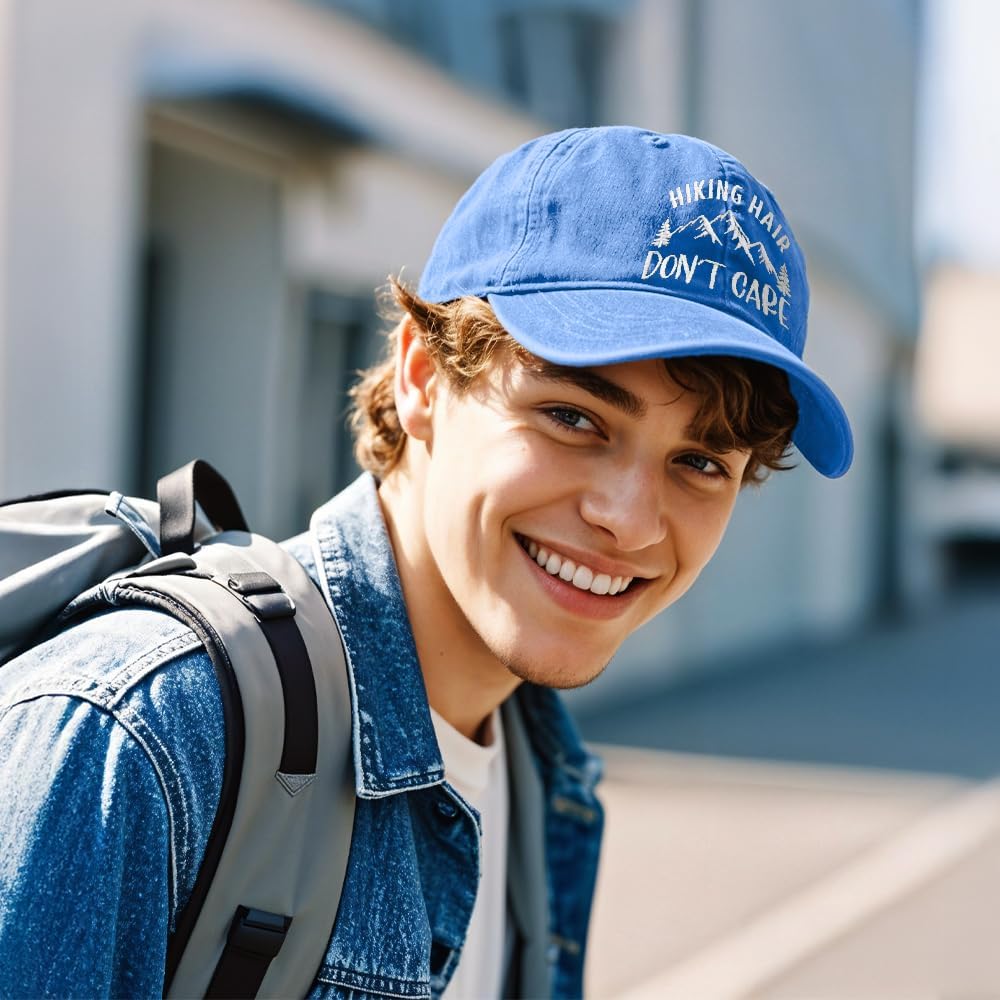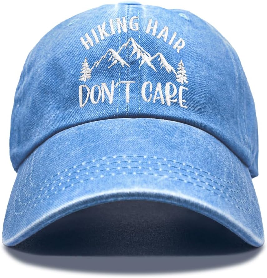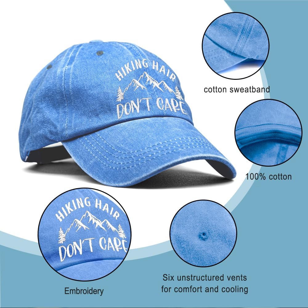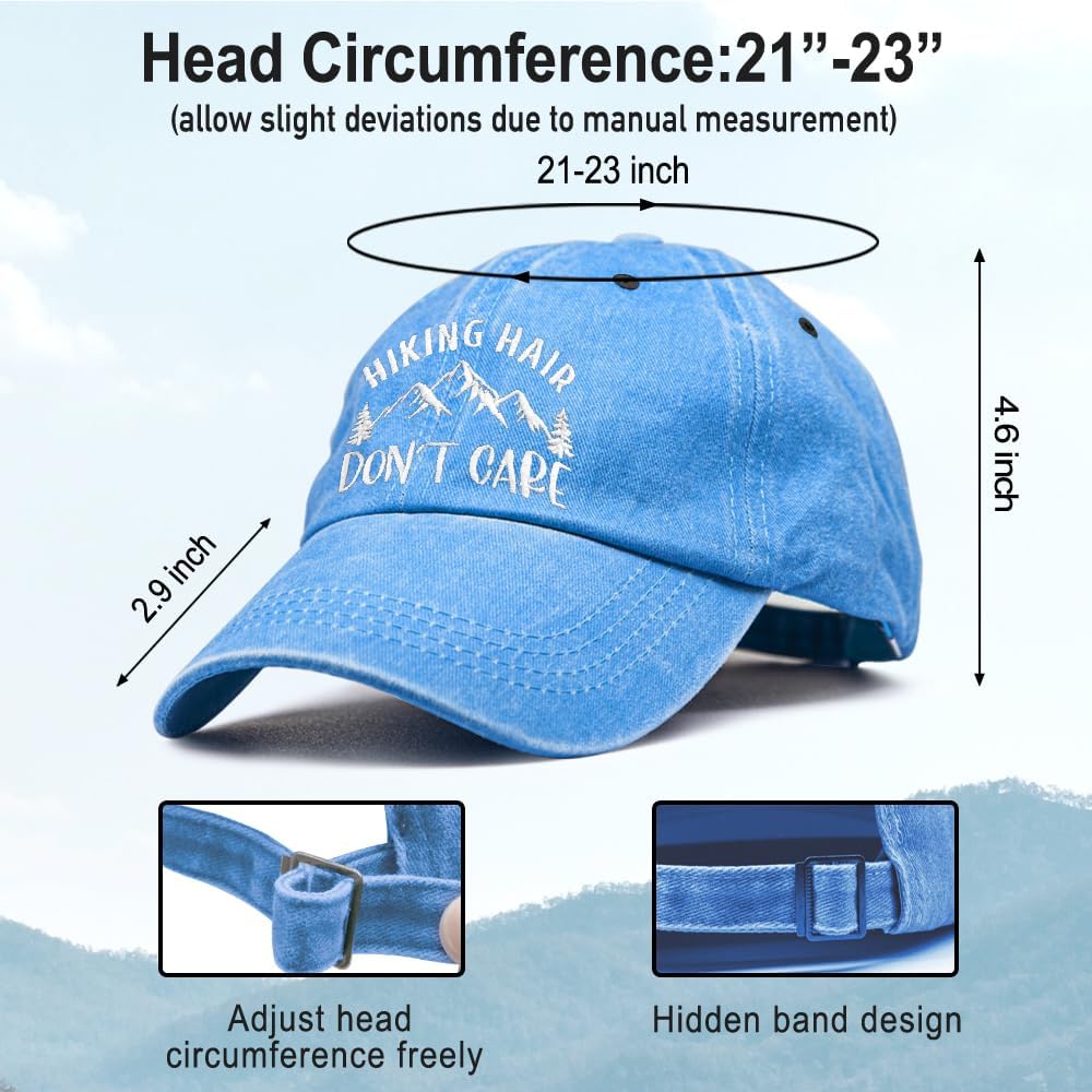 Hiking Hair Don't Care Embroidery Baseball Hats, Adjustable Washed Distressed Sky Blue Ball Cap, Hiking Cap Gifts for Adventure Camping Hiker Lover, Funny Sun Shade Sports Hat for Women Men