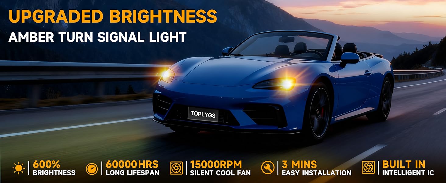 【600% Upgraded Brightness】TOPLYGS Turn signal light 600% brighter than original halogen turn signal light bulb, which is made of 3570 CSP LED chips and 3030 upgraded chips. There are no dark areas or shadows, high Power and 600% brighter providing pure amber lighting output, enables people to have a clearer view of the vehicle's state during turns
