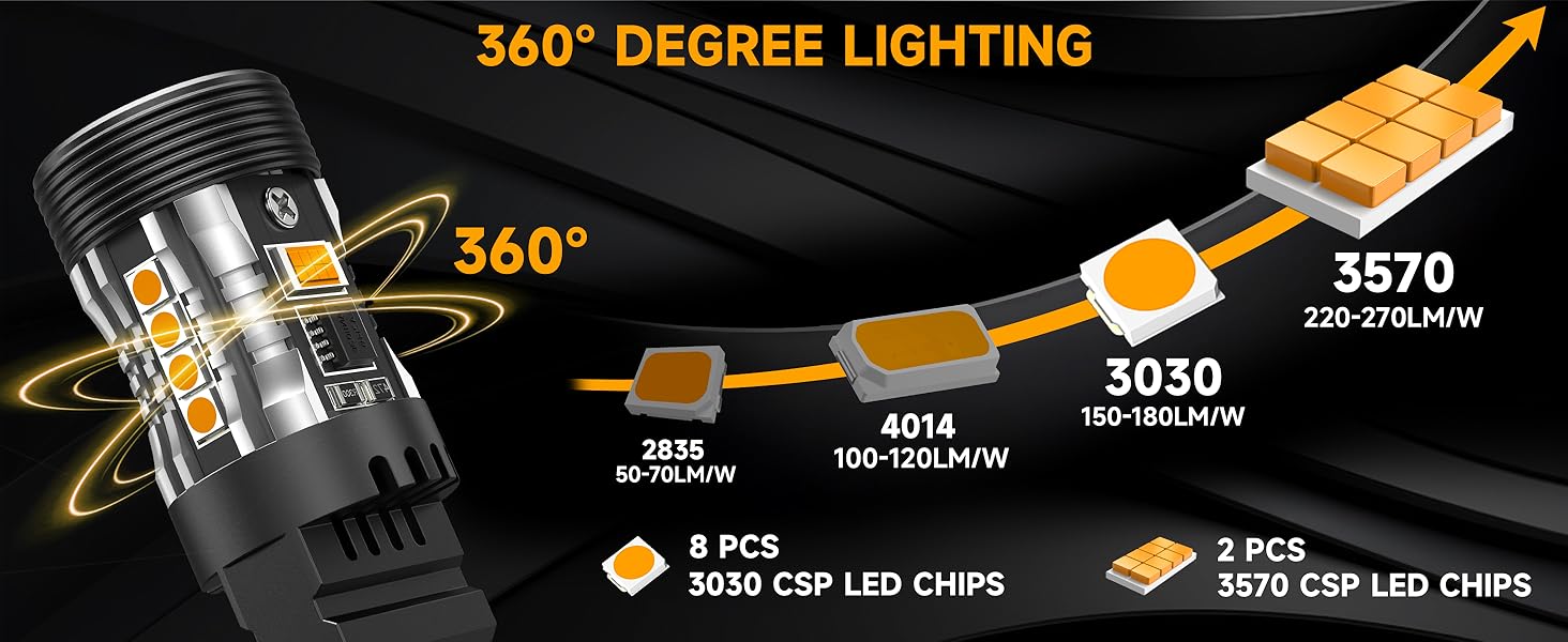 【360° Full Range Lighting】Fusion turn signal LED bulb is manufactured with 3570 CSP LED chips and 3030 SMD chips, enabling 360 degree full range illumination. More noticable when turning, guard your driving safety. Each bulb can provide 600% of brightness and 30 watts of lighting power when each turn signal switch is activated. Even in adverse weather conditions, it ensures that others can notice your vehicle more quickly and clearly
