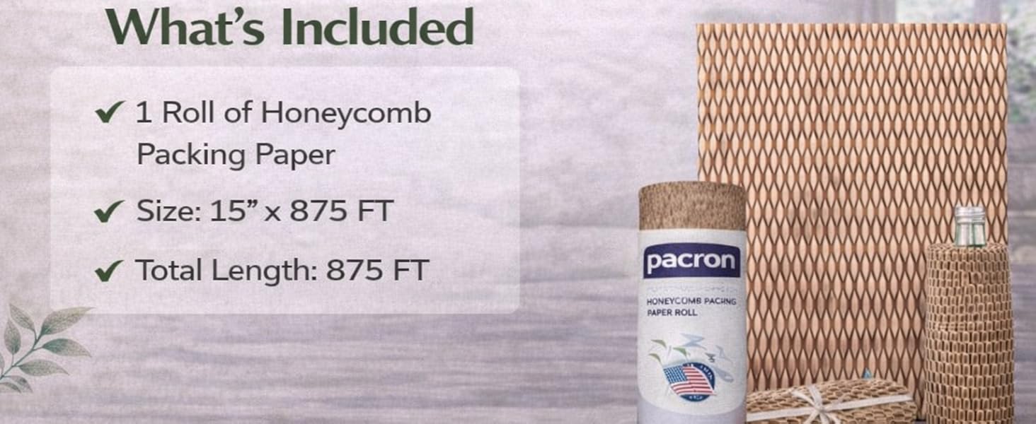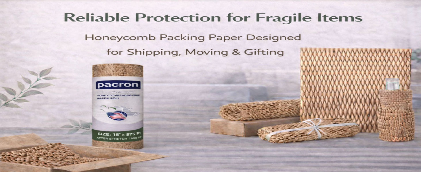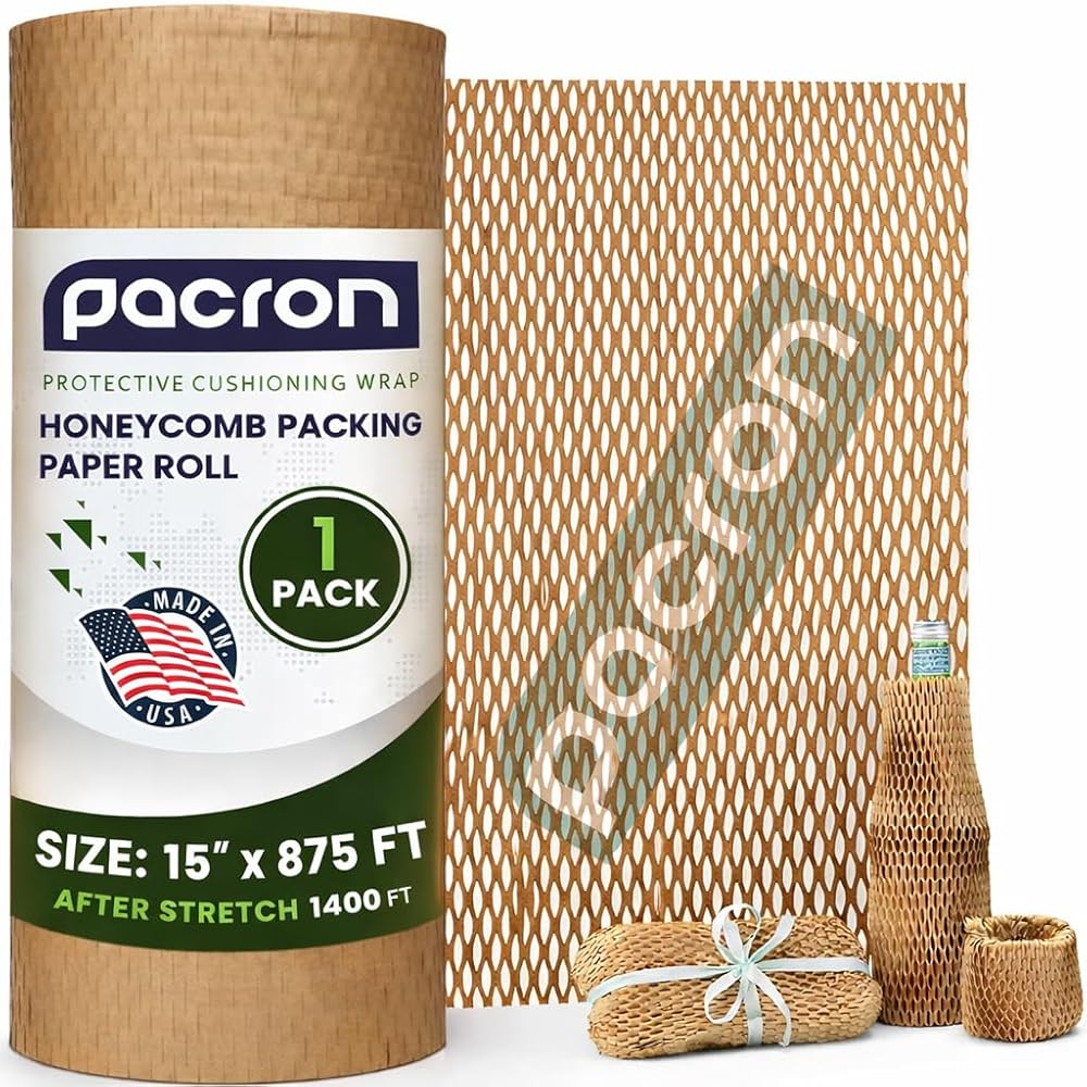 Honeycomb Packing Paper Roll – Eco Friendly Bubble Wrap Alternative for Fragile Shipping, Plastic-Free Honeycomb Wrap for Glass, Ceramics & Moving Supplies, (15"x875Ft)