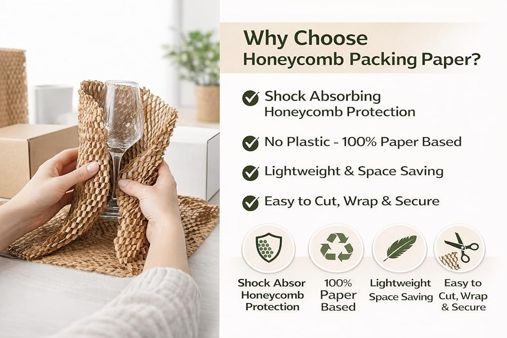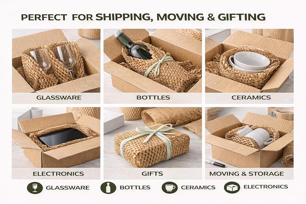 Stop Breakage & Ditch Plastic Bubble Roll Wrap: Protect glass, ceramics, bottles, and fragile items with a plastic-free honeycomb structure that cushions impacts and helps reduce damage during shipping, moving, or storage.