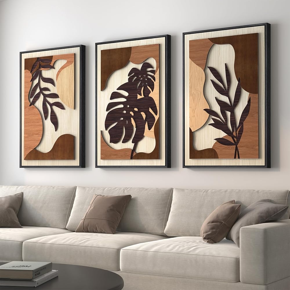 Textured 3D Wood Wall Art Set: This 3-piece framed tropiacl monstera wall art set features layered wood textured with botanical leaf designs in earthy brown tones. The 3D construction brings depth and dimensionality to your walls, offering a balanced blend of rustic and boho styles. Each panel measures 24x36 inches, making it suitable for living rooms, bedrooms, offices, or hallways
