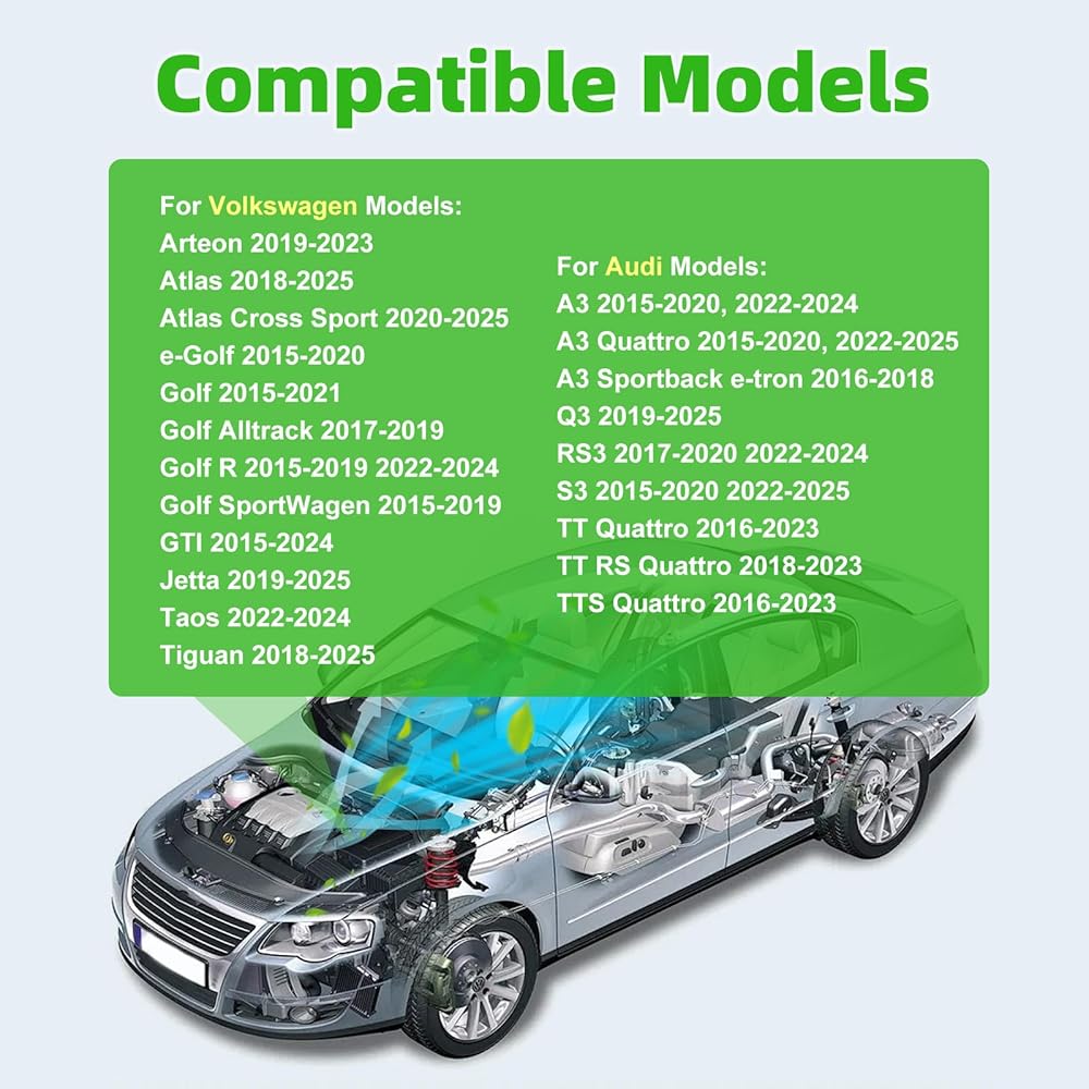 - 【Fits for Volkswagen】Tiguan 2018-2025 | Arteon 2019-2023 | Atlas 2018-2025 | Atlas Cross Sport 2020-2025 | e-Golf 2015-2020 | Golf 2015-2021 | Golf Alltrack 2017-2019 | Golf R 2015-2019 2022-2024 | Golf SportWagen 2015-2019 | GTI 2015-2024 | Jetta 2019-2025 | Taos 2022-2024
