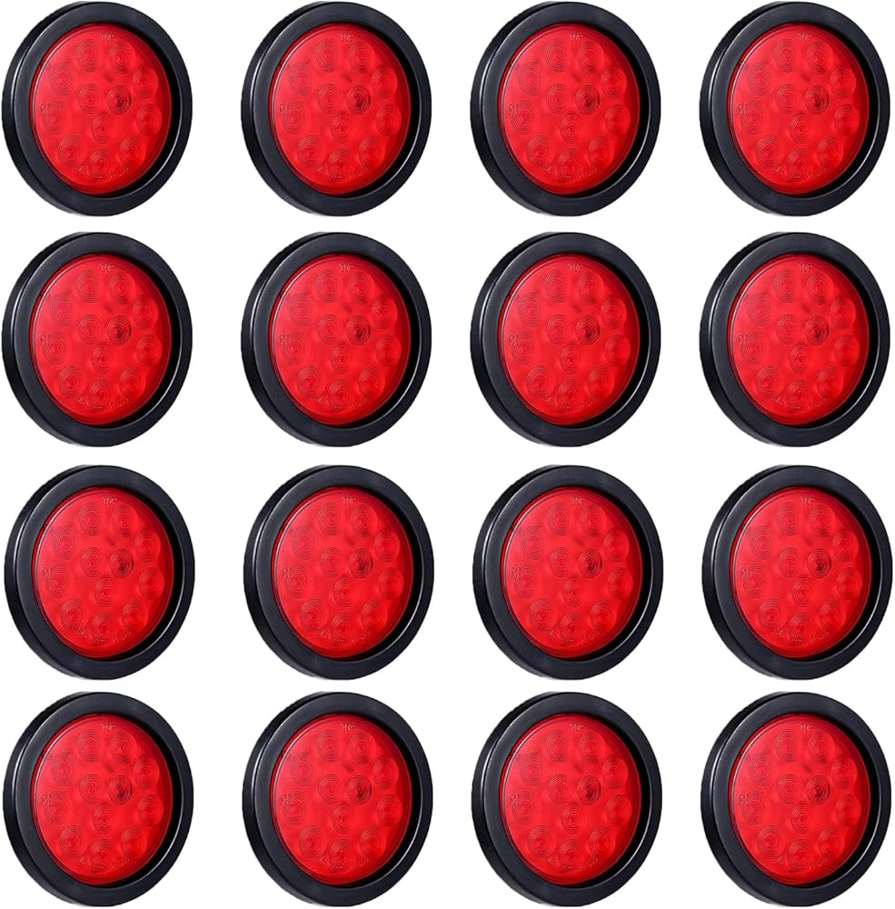 This listing features for 16 pieces 4 inch red led round trailer tail lights, round rubber grommets and 3 prong wire pigtails are included for complete installation;