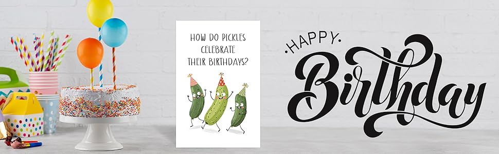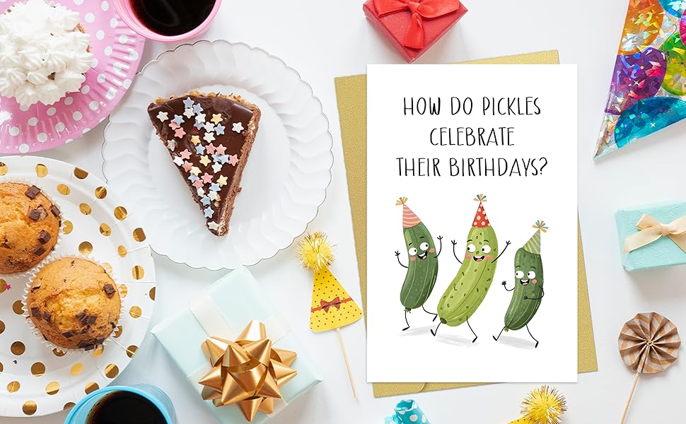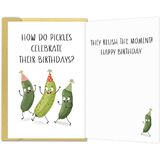 Funny Birthday Card: The front poses a hilarious question( how pickles celebrate), while the inside delivers the perfect pickle pun punchline: "THEY RELISH THE MOMENT! HAPPY BIRTHDAY"