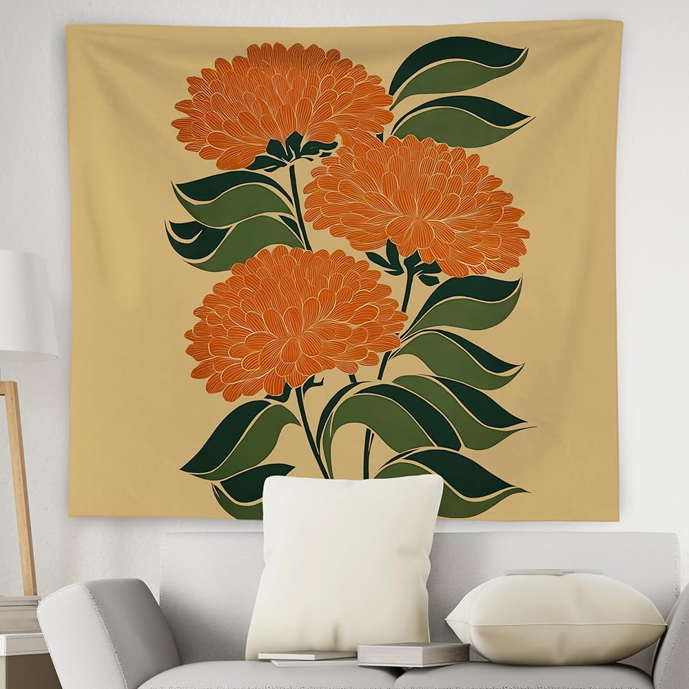 WNAGT Retro Boho Orange Floral Tapestry Wall Hanging, Mid Century Modern Decor, Abstract Art Deco Flower Botanical Wall Blanket Decor for Home Bedroom Living Room, 50x60 Inch