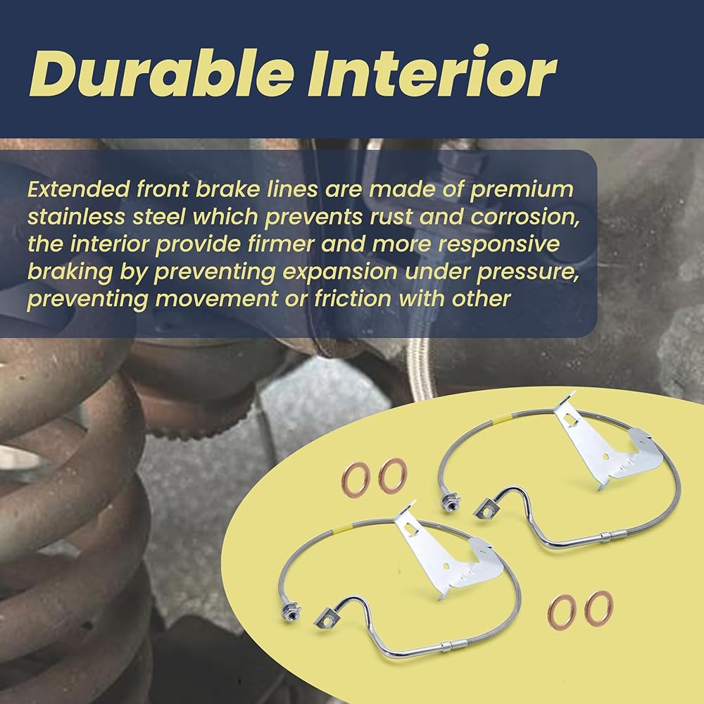 Extended front brake lines are made of premium stainless steel which prevents rust and corrosion, the interior provide firmer and more responsive braking by preventing expansion under pressure, preventing movement or friction with other components
