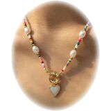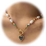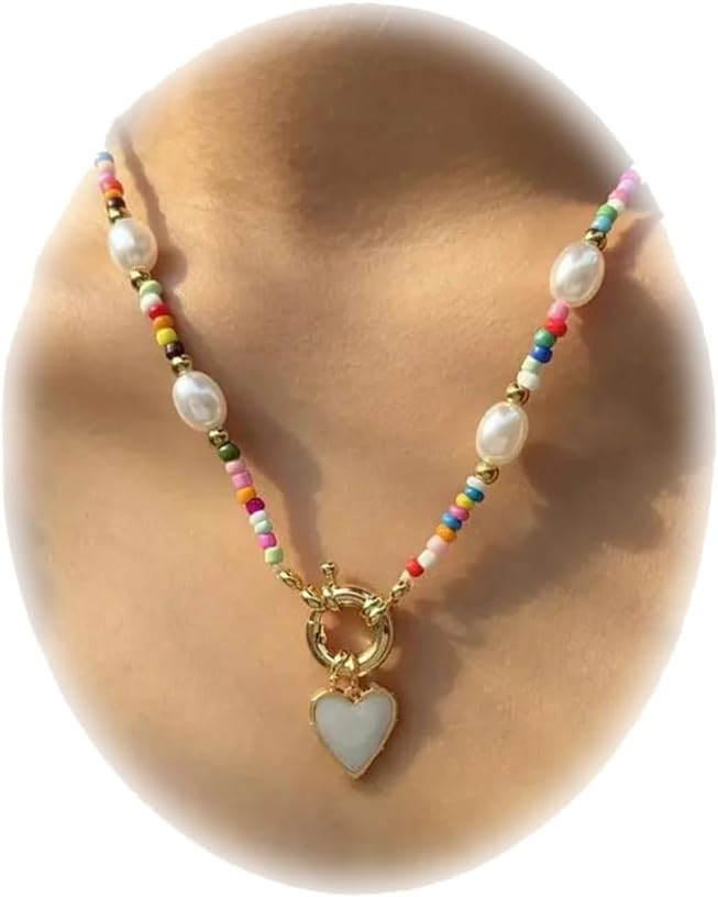 Elevate your style with this charming handmade beaded necklace that perfectly blends bohemian flair with delicate sophistication. The necklace features a beautiful combination of lustrous freshwater pearls and vibrant multicolored beads, creating a playful yet elegant aesthetic. A dainty heart pendant in gold tone adds a romantic touch, while select designs include an adorable daisy flower accent. The choker-style length makes it ideal for highlighting the clavicle area, while the gold-toned spring clasp ensures secure wear. This versatile piece works wonderfully as a statement necklace for casual outfits or as a subtle accent for dressier occasions. Each necklace is uniquely crafted, making it a thoughtful gift option or a special addition to your own jewelry collection. The lightweight design and carefully selected beads provide comfort for all-day wear, while the mix of pearls and colorful beads offers endless styling possibilities.