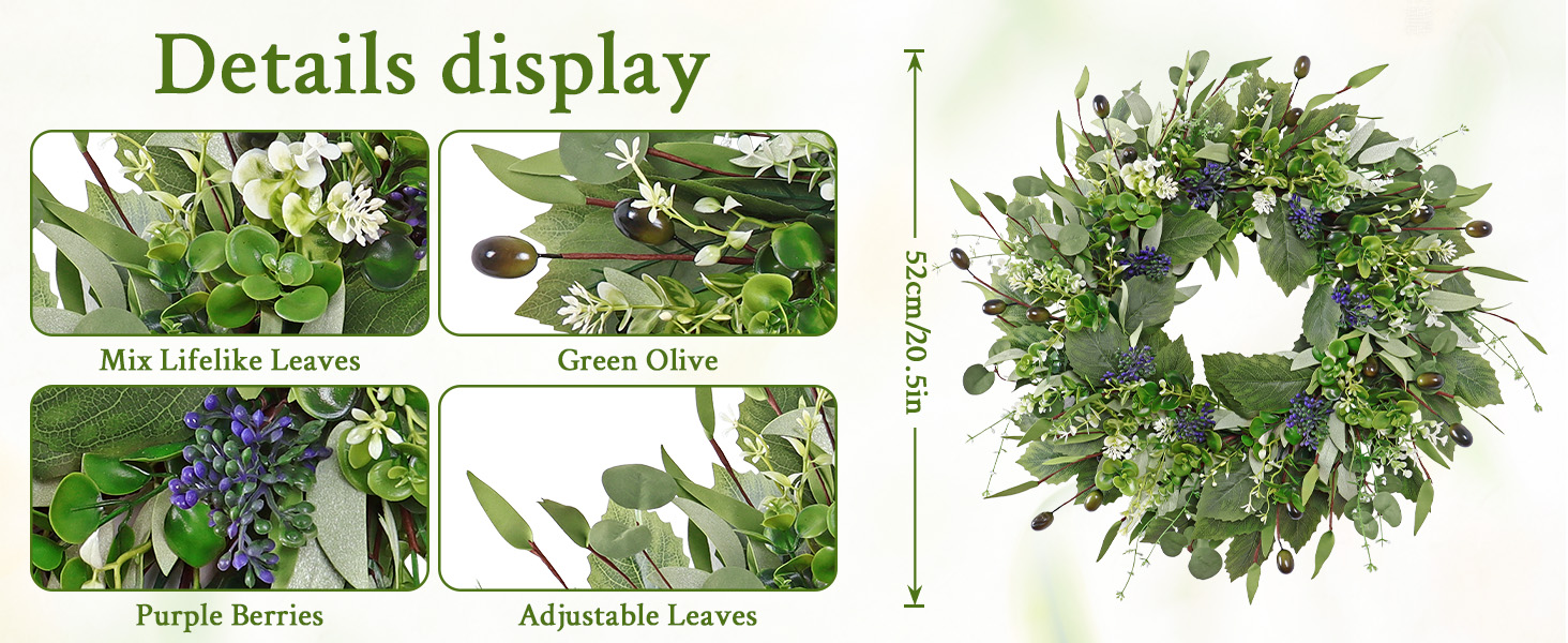 🫒 Ideal Size & Easy Hanging: When you receive the package, you will receive a boxed olive&purple berries wreath with a diameter of approximately 21 inches/ 52cm(gently fluff leaves to restore fullness after unboxing). There is an 10 inch/24cm sturdy base on the back of the wreath, making it effortless to hang on front doors, walls, or porches with hooks, nails, or ribbons—no tools needed!