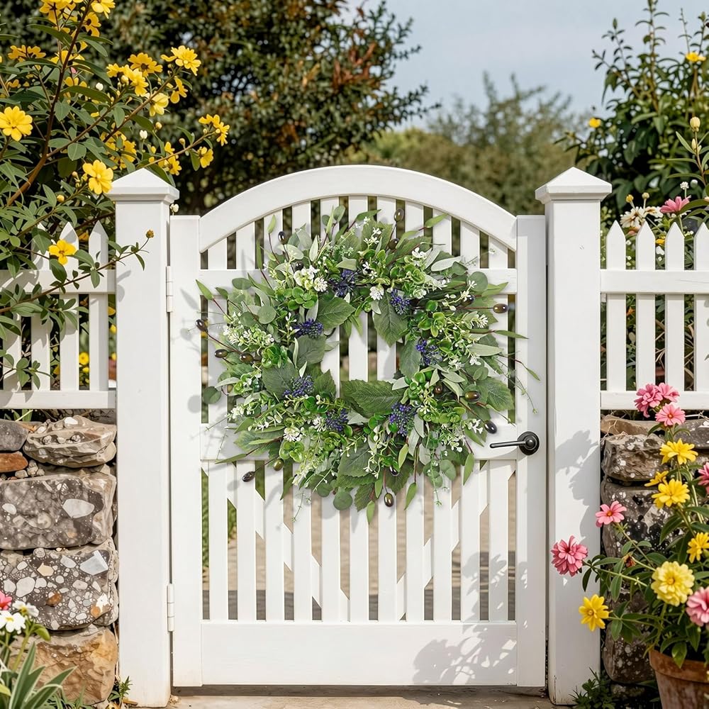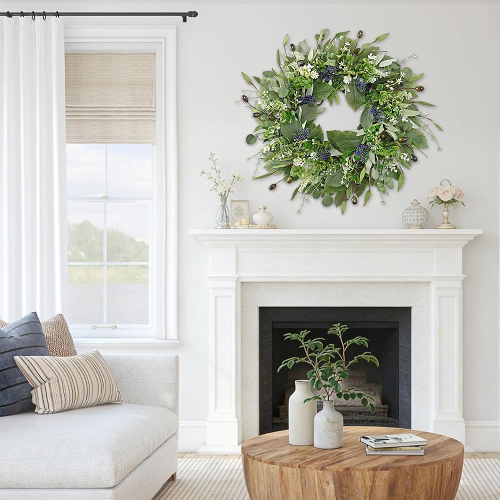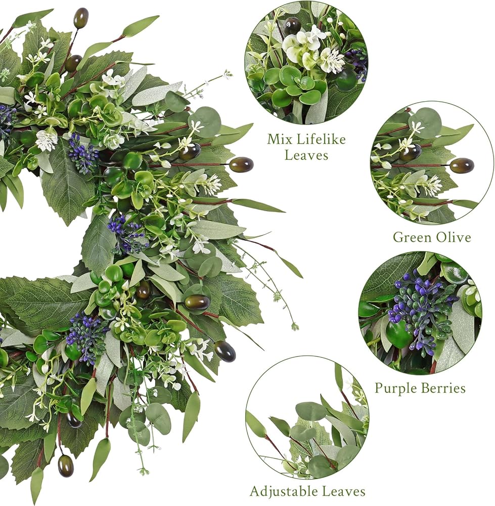 Wreaths for Front Door 21 Inch Artificial Wreath with Eucalyptus Olive Boxwood Leaves Spring Purple Berries Wreaths for Indoor Outdoor Wall Window Home Garden Wedding Decor (Green, 21Inch)