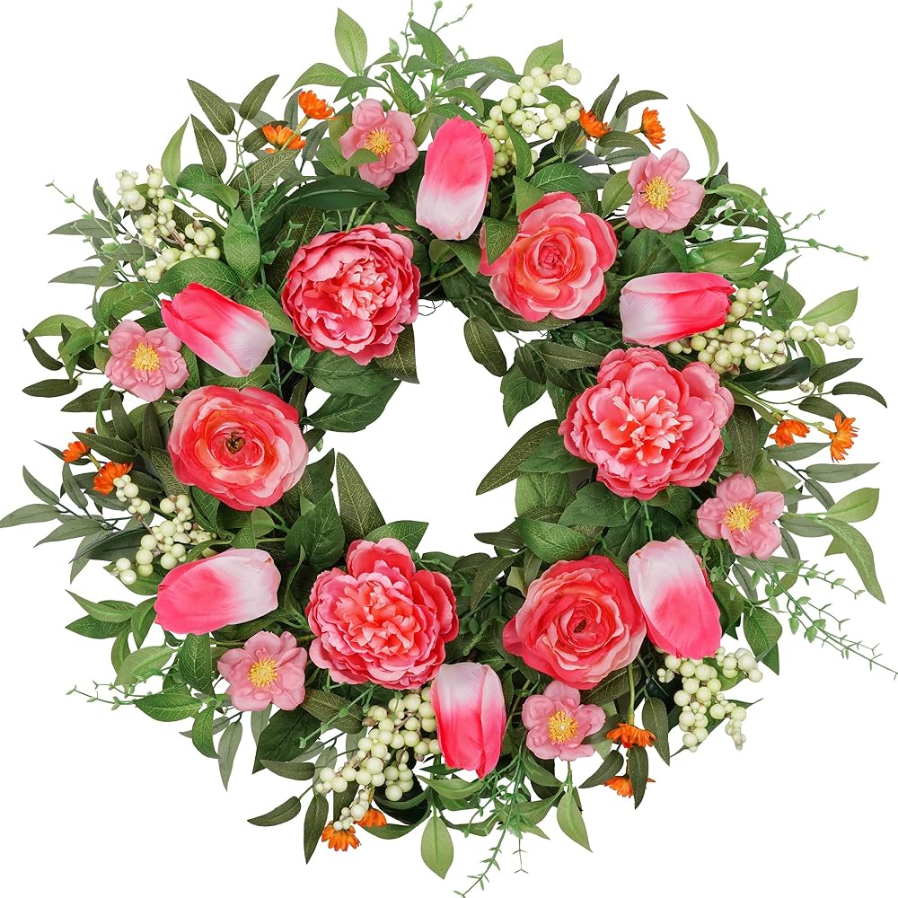 Vlorart 24 Inch Spring Summer Wreath Peony Wreath for Front Door with Pink Tulip, Eucalyptus Leaves, White Berries for Indoor Outdoor Wall Festival Home Farmhouse Wedding Decor