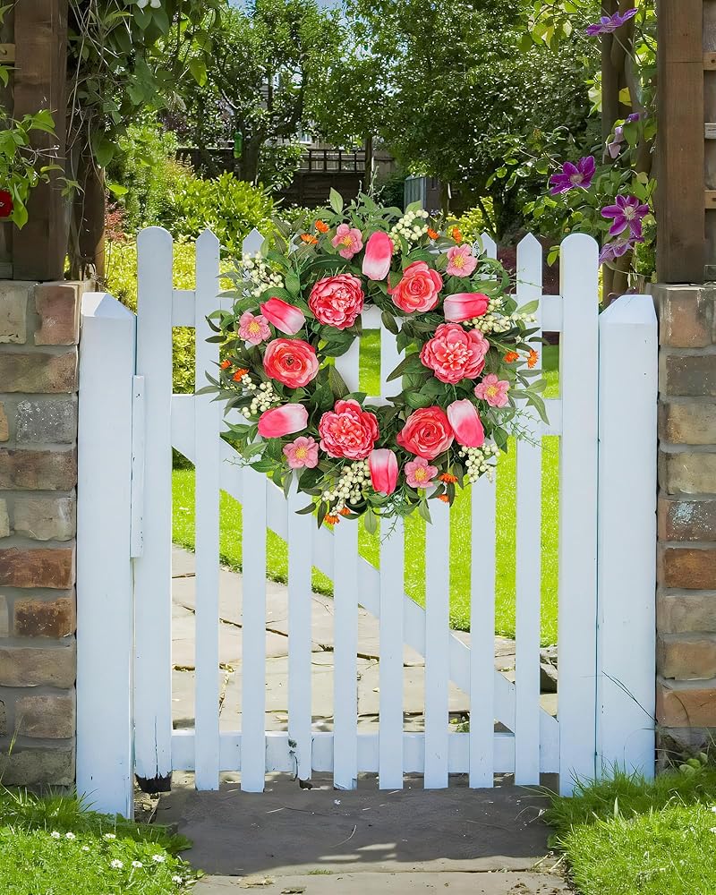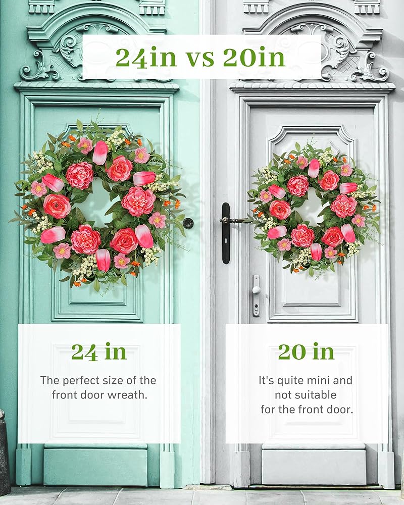 【Garden Fresh Wreath】Bring the beauty of a blooming garden to your doorstep with Vlorart's lush, handmade wreath for front door. Featuring a vibrant mix of pink peonies, tulips, and berries nestled in rich eucalyptus leaves, Vlorart floral wreath is like a year-round bouquet that never fades—perfect for adding a touch of nature's charm to your space.
