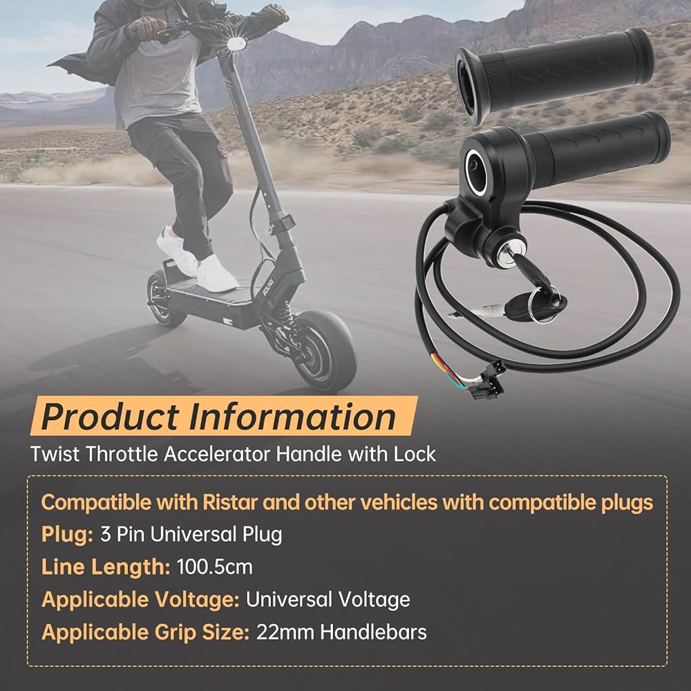 Full Twist Throttle Ridstar Q20, 3-Pin Universal Waterproof Ebike Throttle with 2 Keys,Compatible with Electric Scooter & EBike,Tool-Free Installation on Standard 22.2mm Handlebars