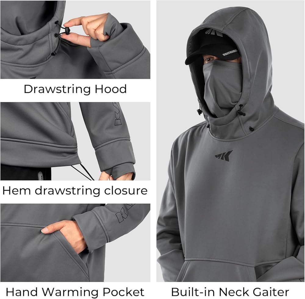 WATER RESISTANT & WINDPROOF – This fleece-lined pullover hoodie is made from softshell water-repellent fabric that also offers wind protection, keeping you warmer longer. The 3-panel hood includes a neck gaiter & drawstring to seal in warmth while you're out on the water.