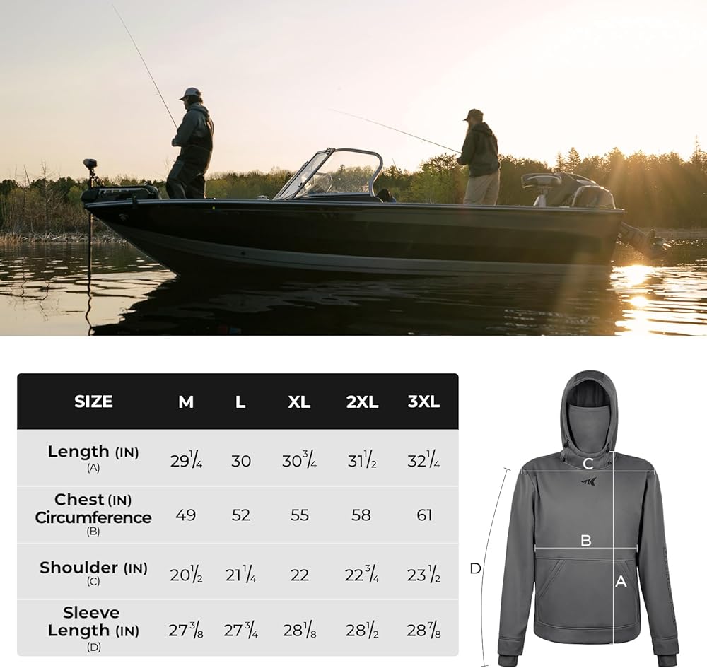 BUILT-IN NECK GAITER & THUMB HOLES – Wear this hoodie in a variety of ways for added warmth, including the built-in neck gaiter for maximum weather and wind protection. The flexible inner cuffs hook over your thumb for added warmth and wind protection. Prevent your sweatshirt sleeves from riding up your arms while casting & reeling, making this hoodie the perfect choice for winter fishing.