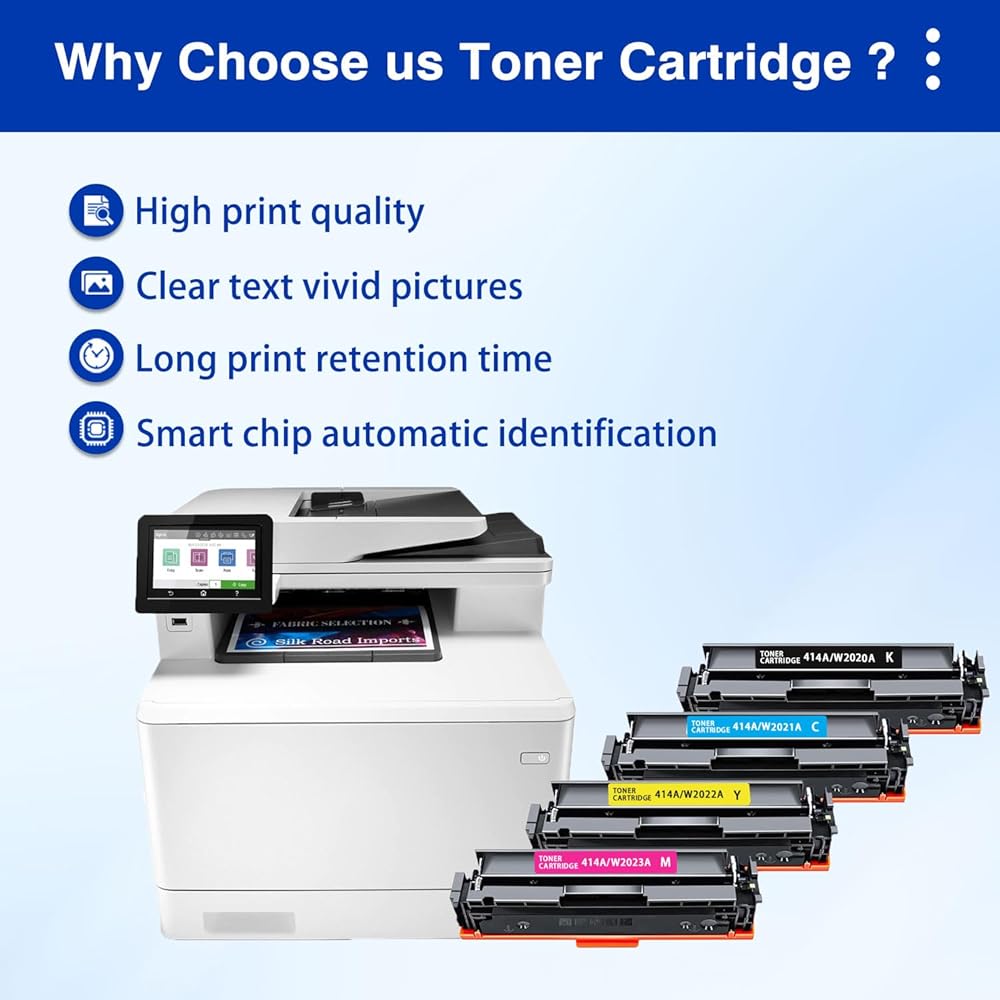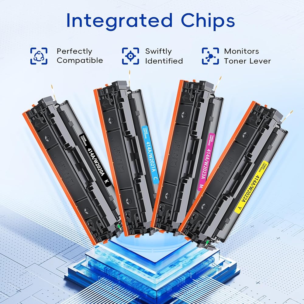 Package Contents:4 Packs 414A toner cartridges set contain 1 x 414A black toner cartridge black , 1 x 414A cyan toner cartridge, 1 x 414A yellow toner cartridge, 1 x 414A magenta toner cartridge(WITH CHIP)